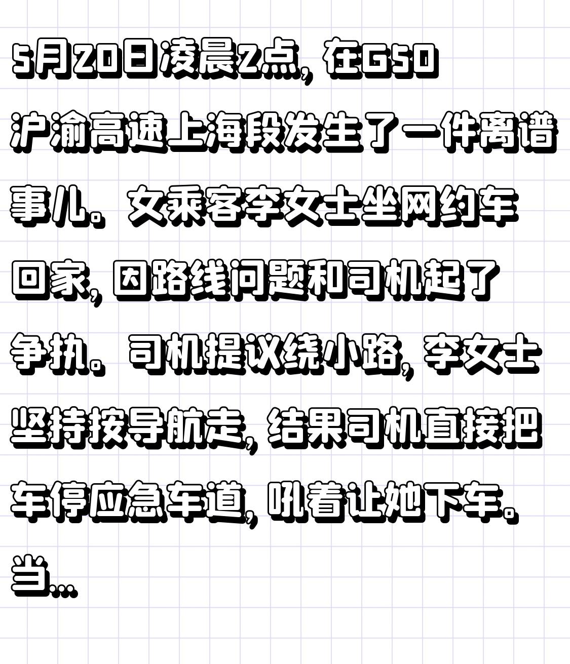 5月20日凌晨2点,在G50沪渝高速上海段发生了一件离谱事儿。女乘客李女士坐网约