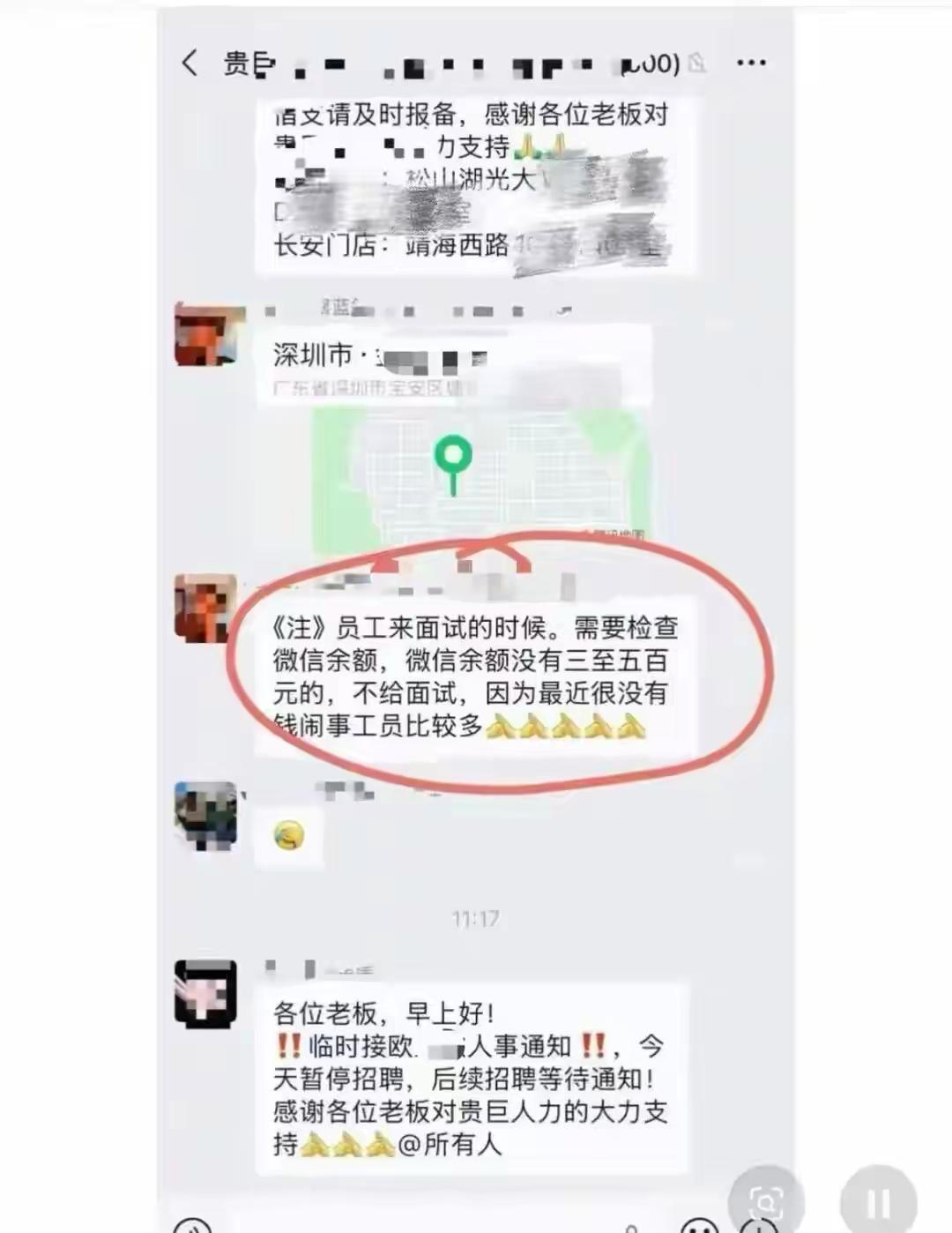 中介给金主进行辩解,讲述之前有应聘的员工动不动就闹事,说没钱吃饭了、要报警之类。而最终那家深圳科技公司则解释说,有些工人只做一两天要离职,要求结算工资必须发钱,说自己没钱吃饭了。他们觉得很难处理,于是就提出了这个要求。