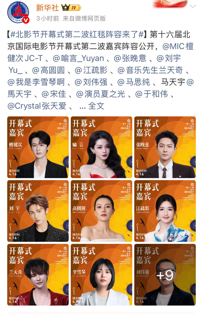 北影节开幕式红毯阵容第十六届北京国际电影节开幕式首波嘉宾阵容公布:陈楚生、陈建斌