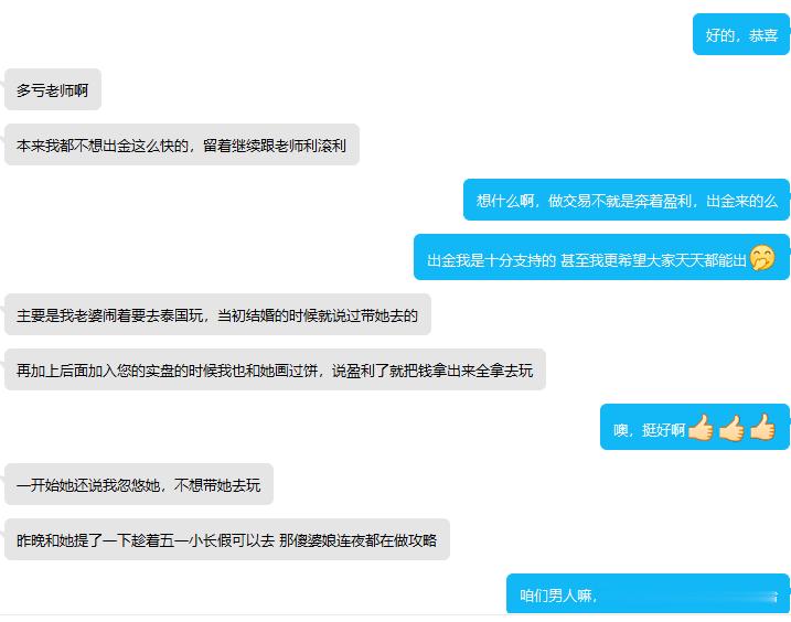 看到客户能够在市场里实现盈利,然后出金,真的心里面成就感满满!咱们日辛夜苦地盯盘交易是为了什么,还不是希望通过市场来积累财富,最终实现时间自由、财富自由,摆脱生活的桎梏,活成哪个自己想要成为的样子!屏幕前的你是否夜会羡慕舒先生能够现当初许下的诺言,带着娇妻周游列国呢?那就拿出你的诚意,踏出你的第一步,只要你有魄力相信我,我就有实力带好你!黄金金价