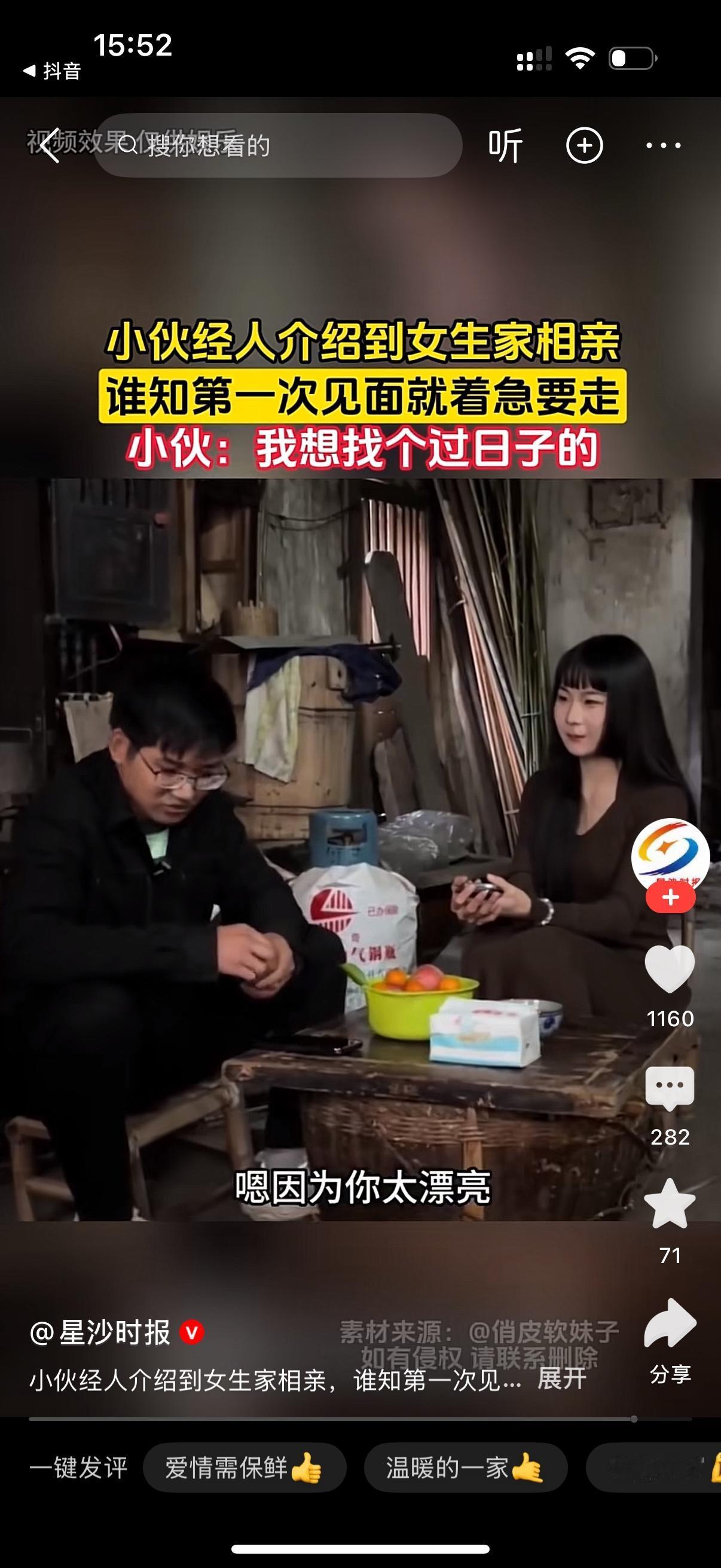 小伙经人介绍到女生家相亲。小伙看到女孩转身就要离开。媒人拉住他,说干啥呢?小伙说,我妈叫我找一个过日子的。媒人说,你来都来了,先聊一聊。小伙子和女生坐在一起交谈了起来。小伙介绍自己是做厨师的,问女孩干什么工作?女生说,我在杭州那边做陪玩的。小伙惊呼,陪玩?是三陪吗?还有陪吃陪喝?女人脸都绿了。小伙愤然离开,嚷嚷什么玩意。