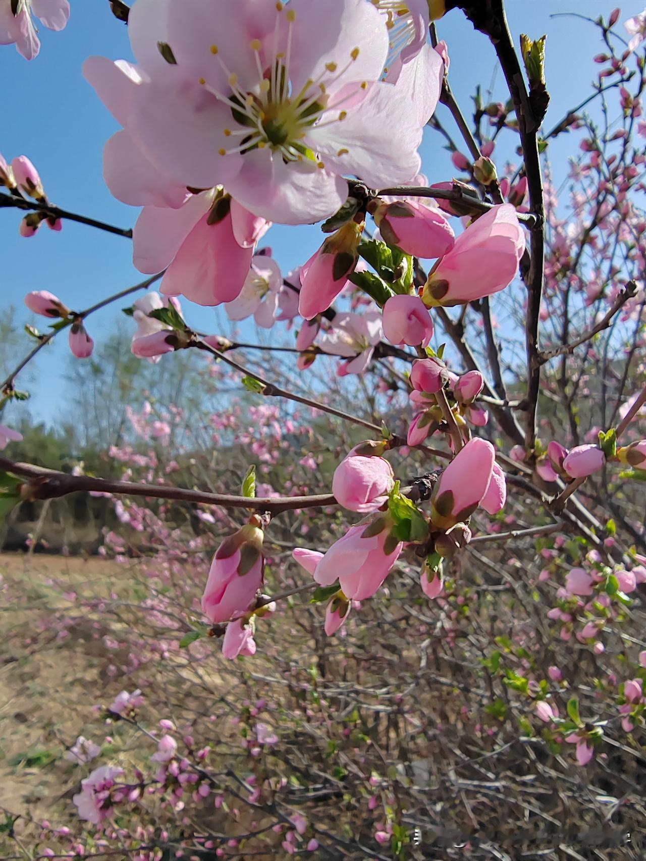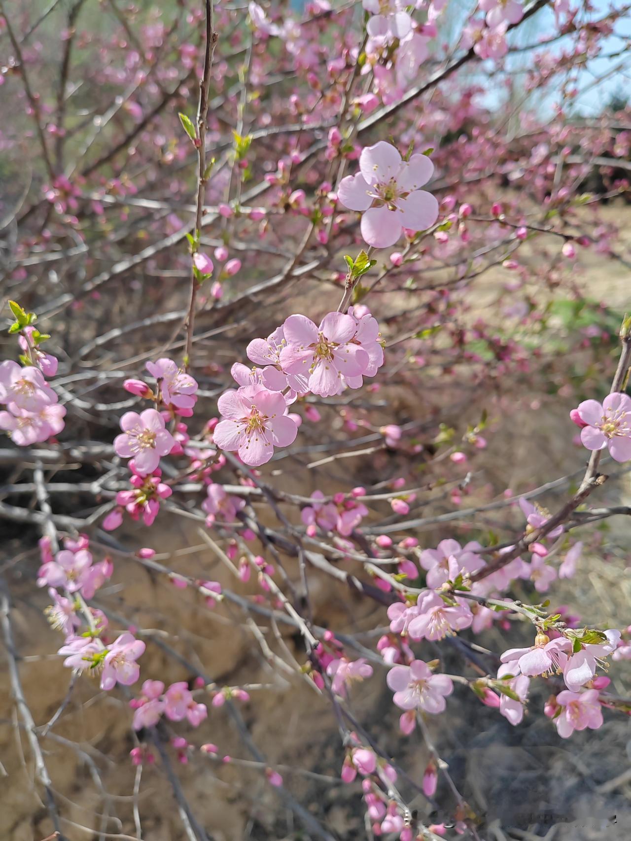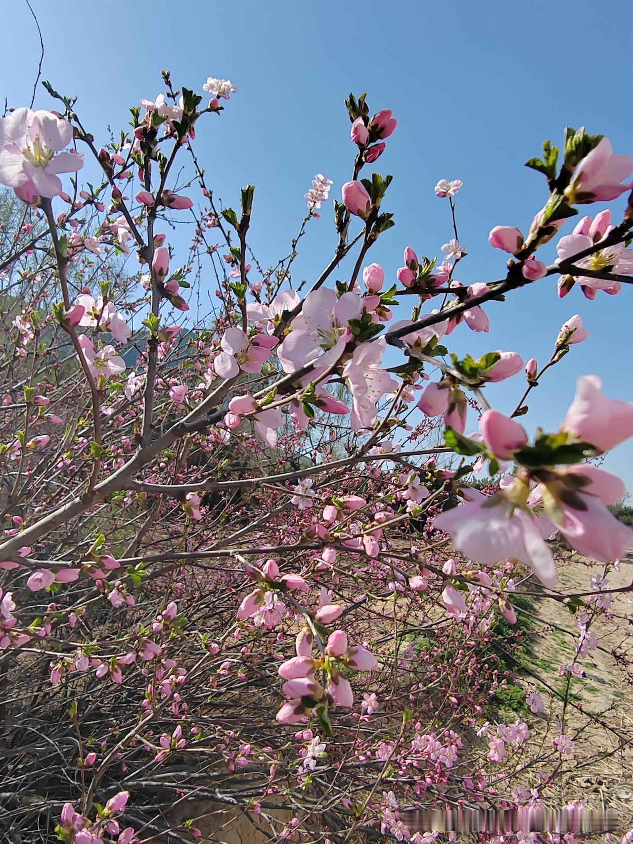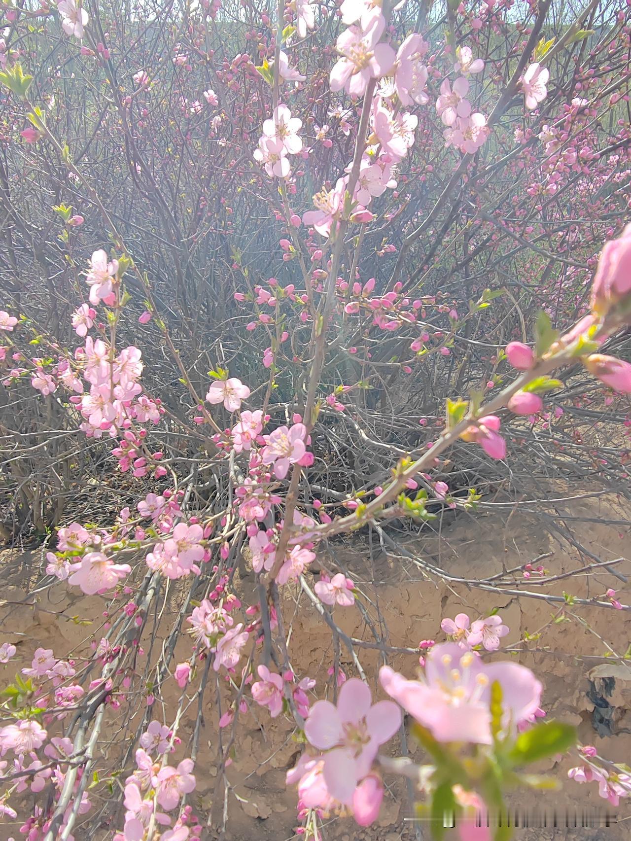田梗边一棵不知名的小树开满了鲜艳的粉红色的花儿,极像桃花但却不是桃花,叶子和榆树
