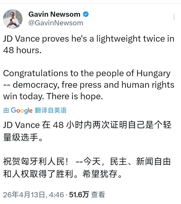 4月13日,加州州长纽森直接公开骂JD·万斯:“你48小时内两次证明自己没啥用。恭喜匈牙利人民,民主和自由赢了,还有希望。”