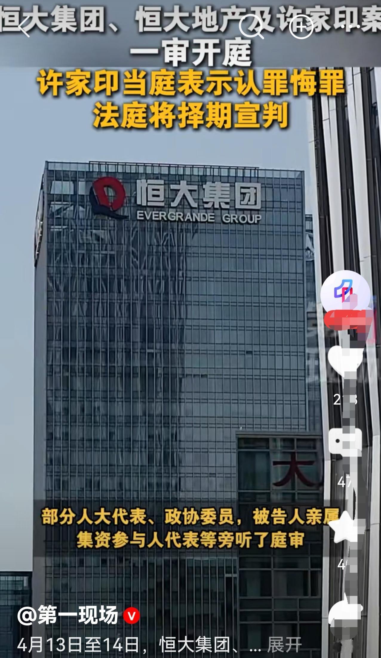 官方发布正式消息:许家印以及恒大集团系列案一审公开开庭。 2026年4月13日