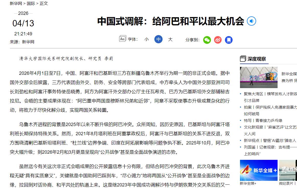 2026年4月1号到7号,中国、阿富汗、巴基斯坦三方,在咱们新疆乌鲁木齐开了一周的会,不是正式谈判,但级别不低。