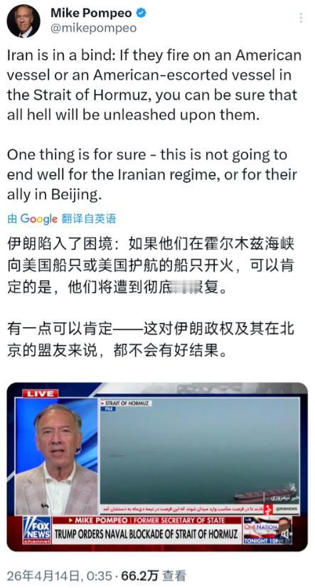 4月14日,美国前国务卿蓬佩奥又出来刷存在感,对着伊朗瞎嚷嚷:“伊朗陷入了困境:如果他们在霍尔木兹海峡向美国船只或美国护航的船只开火,可以肯定的是,他们将遭到彻底的报复。有一点可以肯定——这对伊朗政权及其在北京的盟友来说,都不会有好结果。”