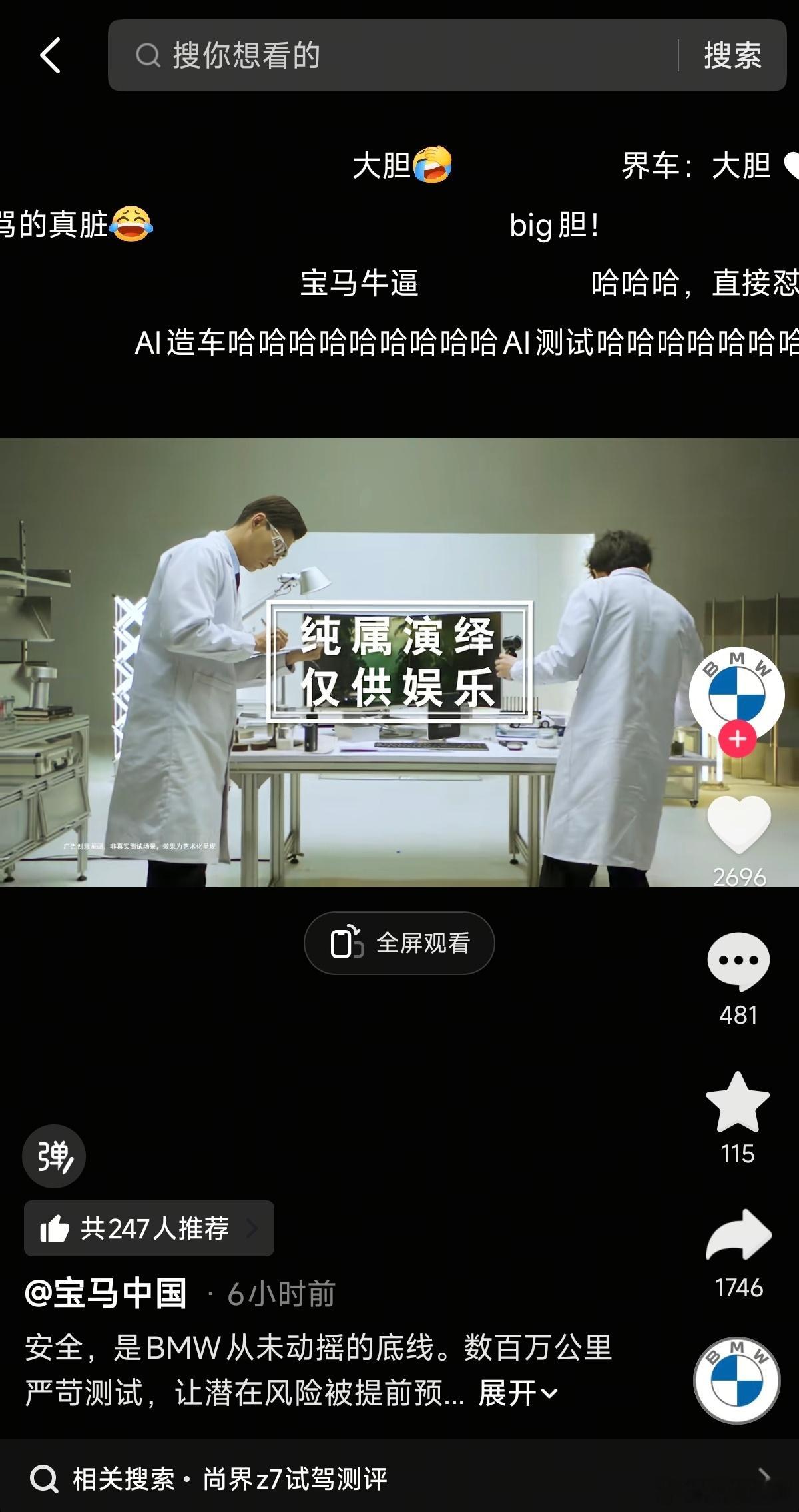 宝马今天宣传安全测试的那个视频,在微博上开启了评论精选。