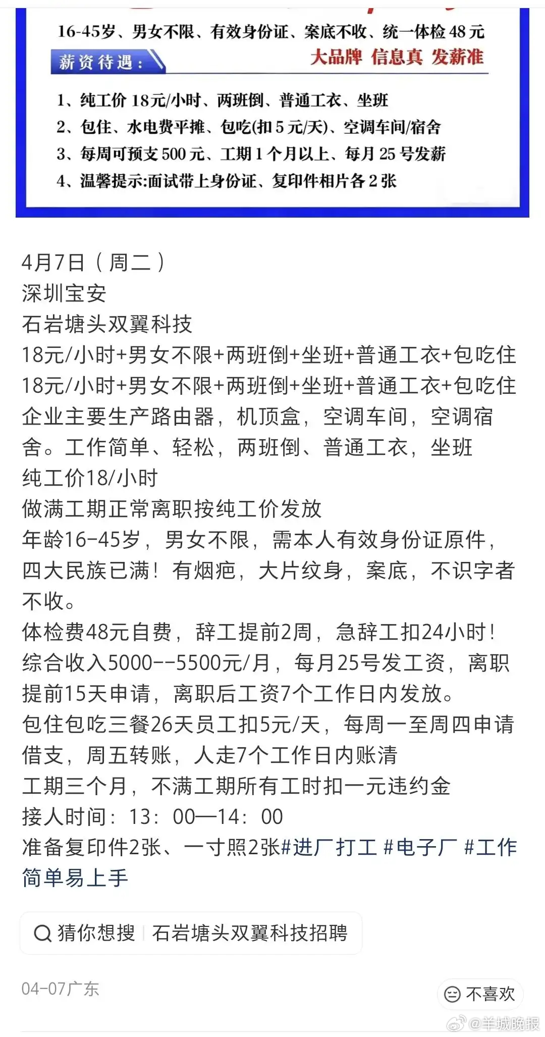 羊城晚报记者在社交平台检索发现,有不少中介发布深圳市双翼科技股份有限公司的招工贴,工作岗位包括组装、包装、检测等,工资为18元一小时左右,有招工贴特别提到,“辞工需提前2周,急辞工扣24小时(工资)。”