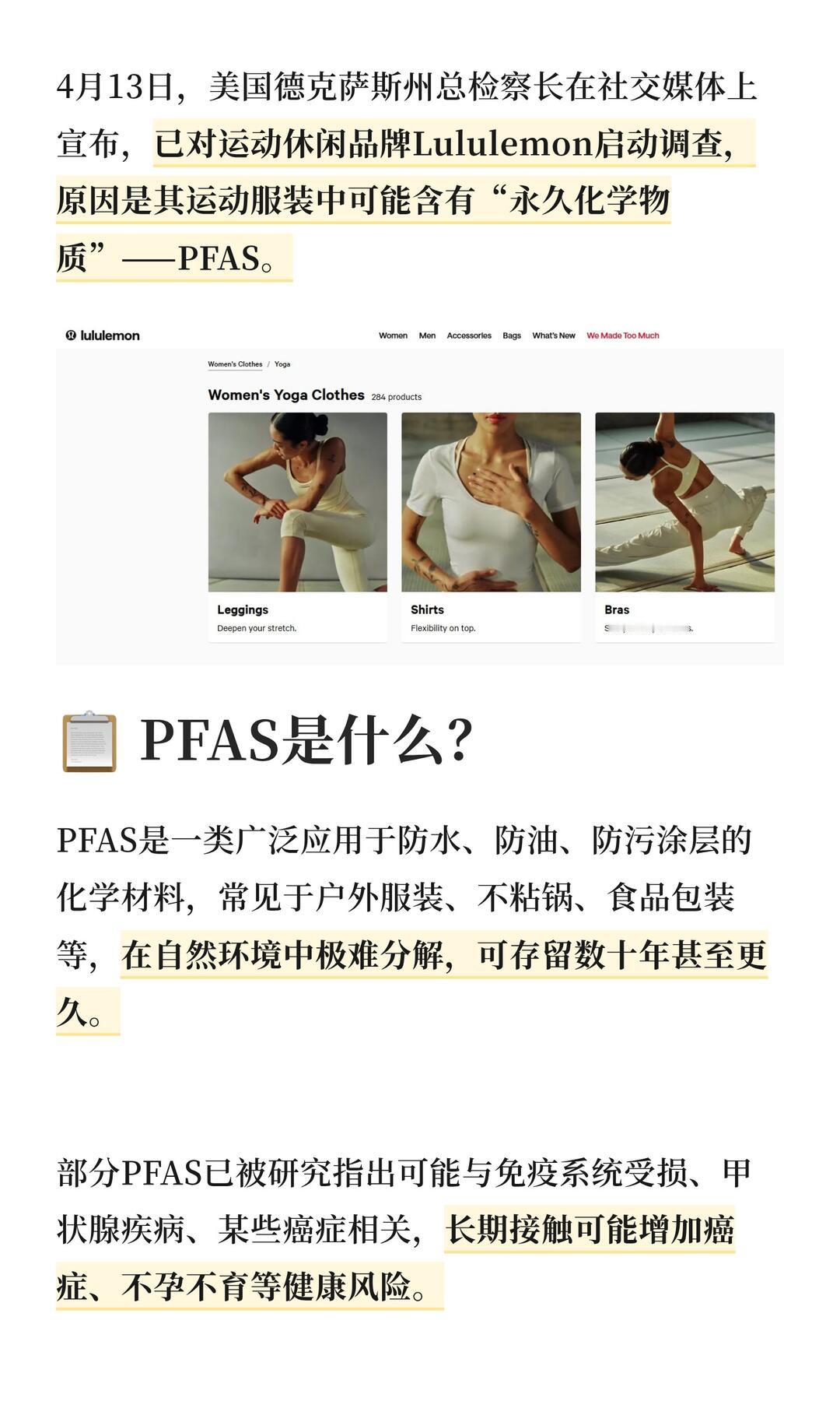 Lululemon被调查 你要是冲锋衣、防水外套添加“PFAS”我能理解但你在瑜伽裤,这种贴身衣物上添加防水涂层我就看不懂了
