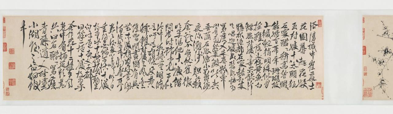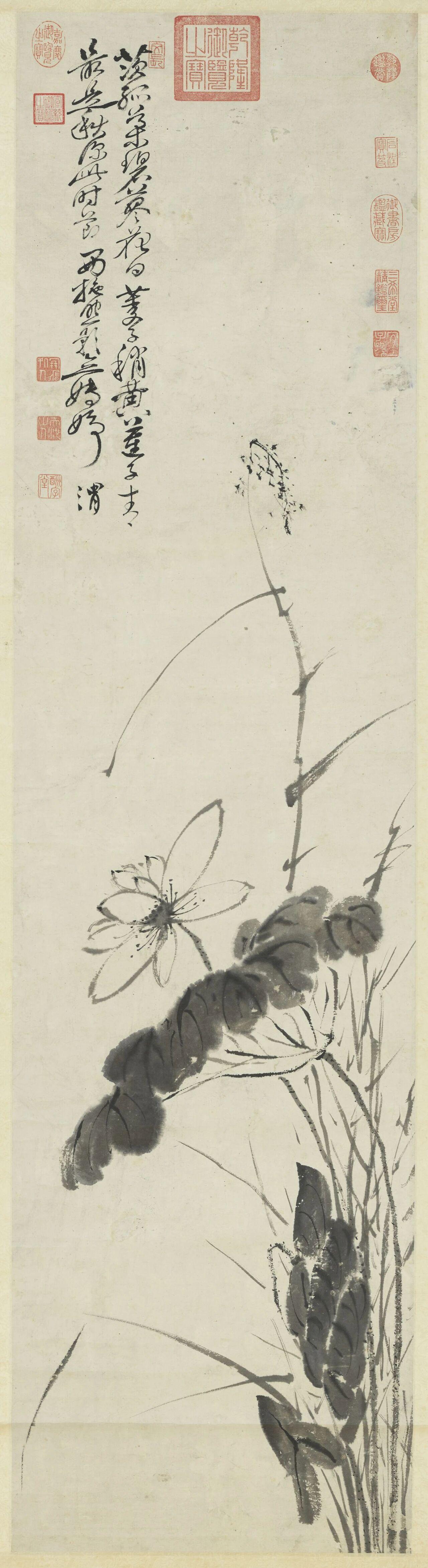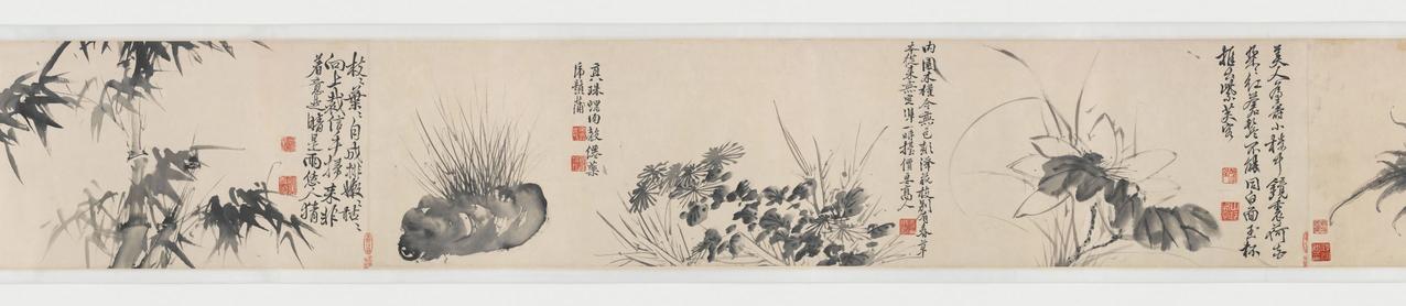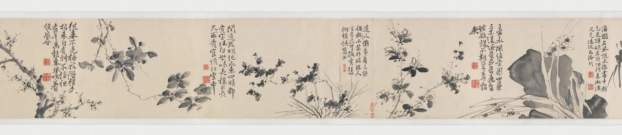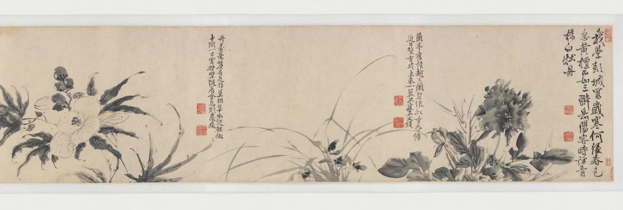 《墨花九段图》现藏于北京故宫博物院,纸本墨笔长卷,绘牡丹、荷花、秋菊、水仙、梅花、葡萄、芭蕉、兰花、修竹等九段花卉,每段配有自题七绝,诗书画相映,晚年笔墨高度自由与情感宣泄的画作。