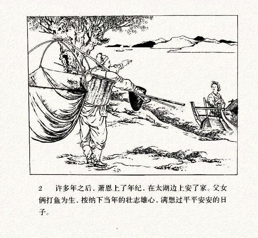 《打渔杀家》由人物画大师徐燕孙1951年创作,采用传统白描技法,原名《萧恩打渔》,作品改编自京剧传统剧目,讲述梁山好汉阮小七隐姓埋名后反抗恶霸的故事。