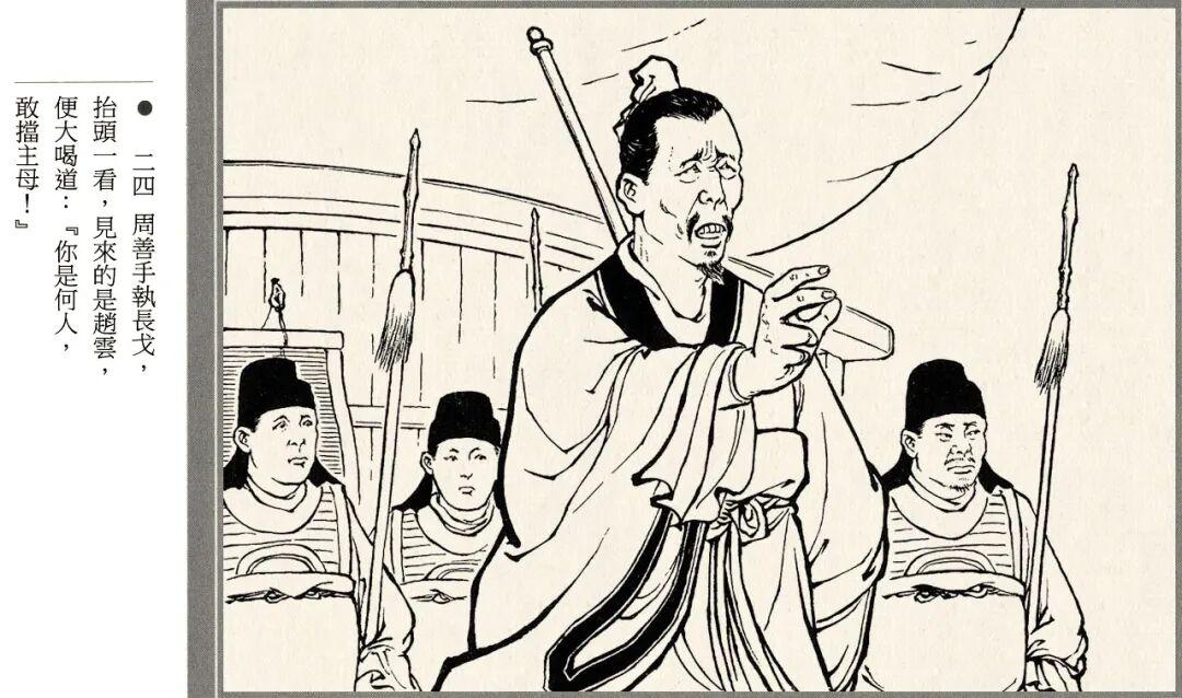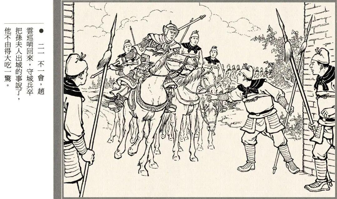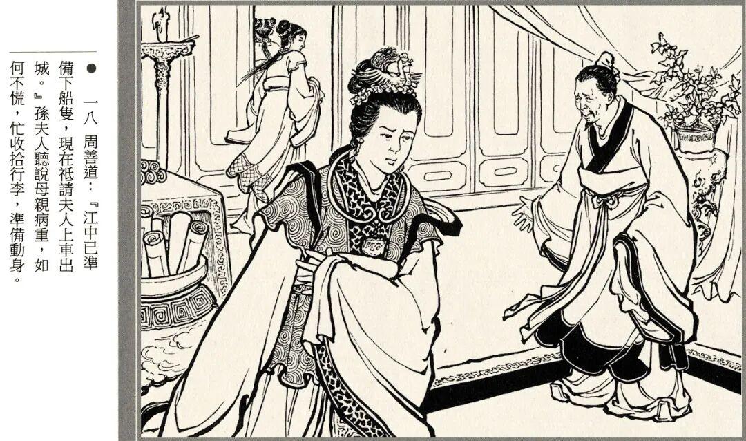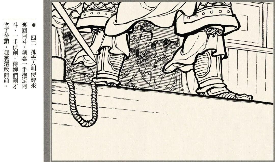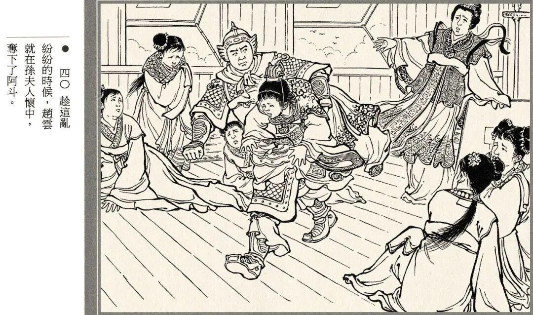 连环画的线描风格略带写意画风,人物神态和江面细节都很生动,孙夫人戟指怒喝、阿斗紧抓赵云衣领等场景都有大量特写镜头。