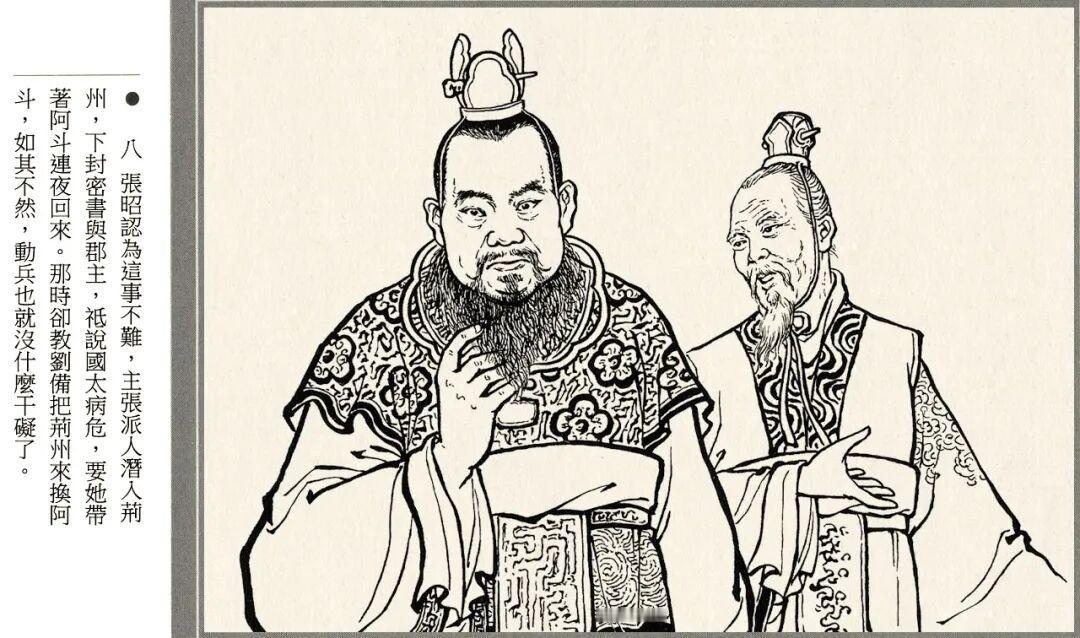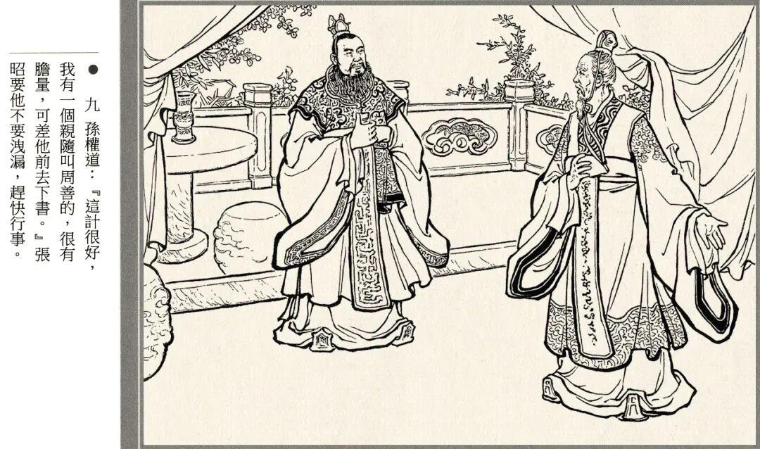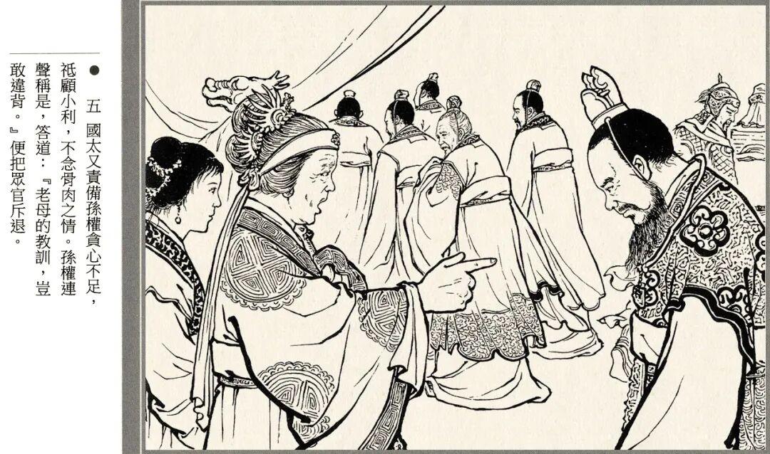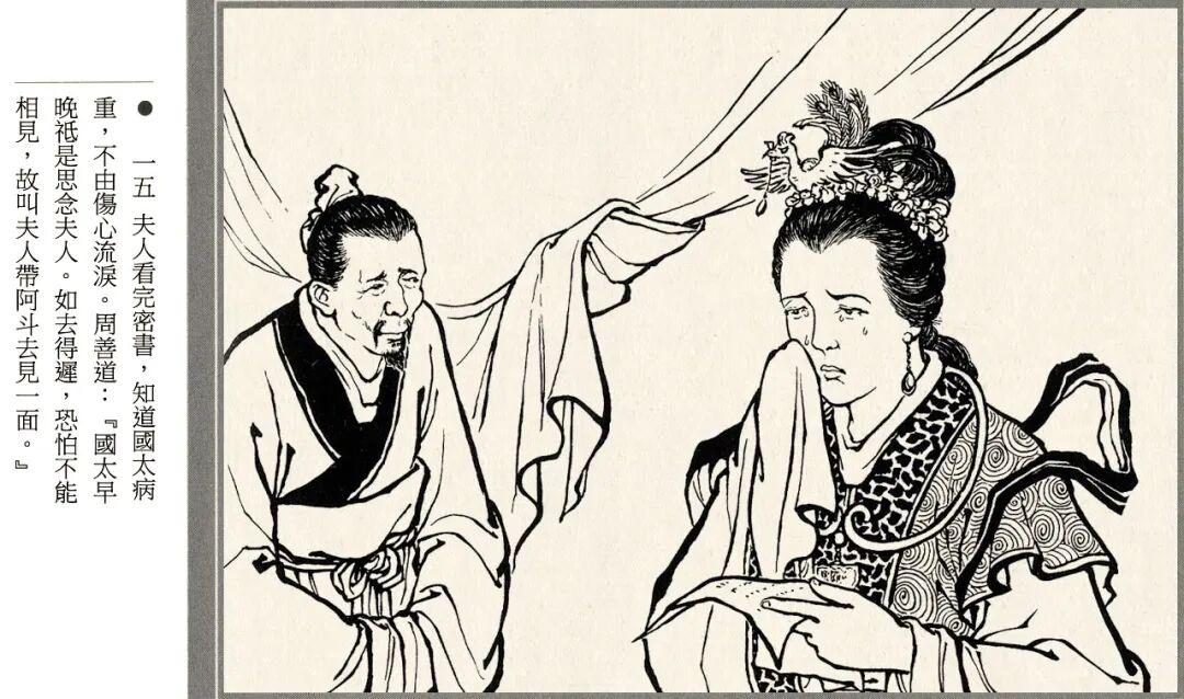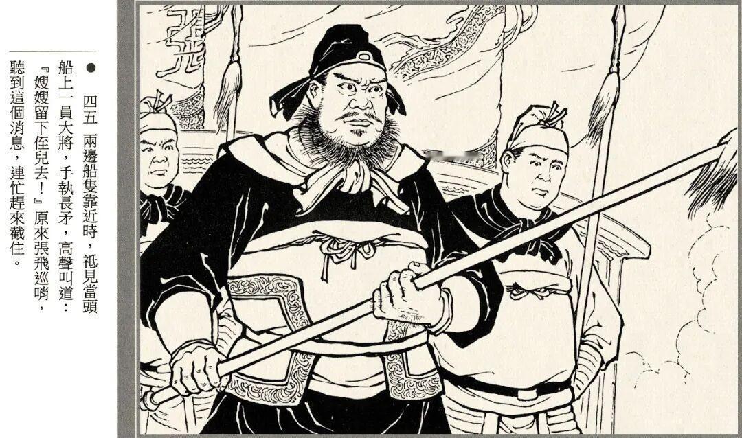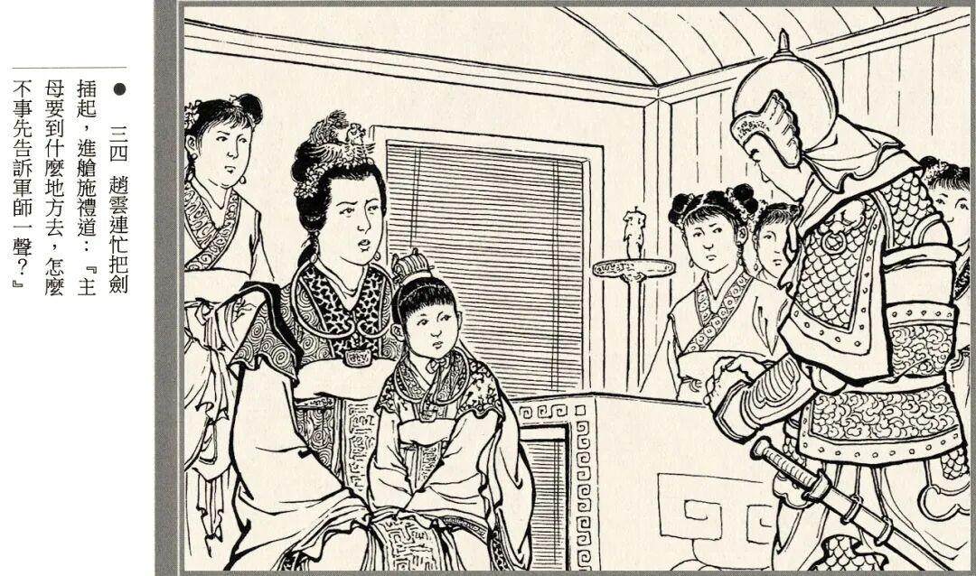 连环画的线描风格略带写意画风,人物神态和江面细节都很生动,孙夫人戟指怒喝、阿斗紧抓赵云衣领等场景都有大量特写镜头。