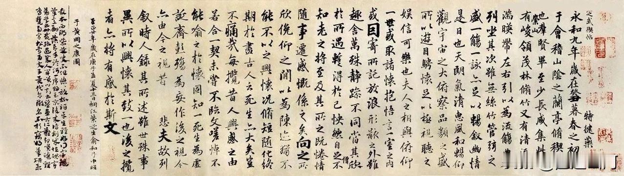 唐摹派冯承素摹的“神龙本”,普遍被认为是最接近王羲之真迹的版本。采用双钩填墨技法,精准还原了原作的笔锋与墨迹细节,卷首钤有唐中宗“神龙”小印,现存于北京故宫博物院。