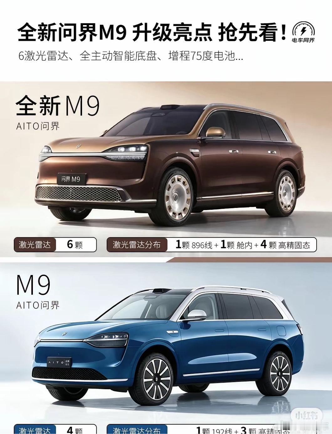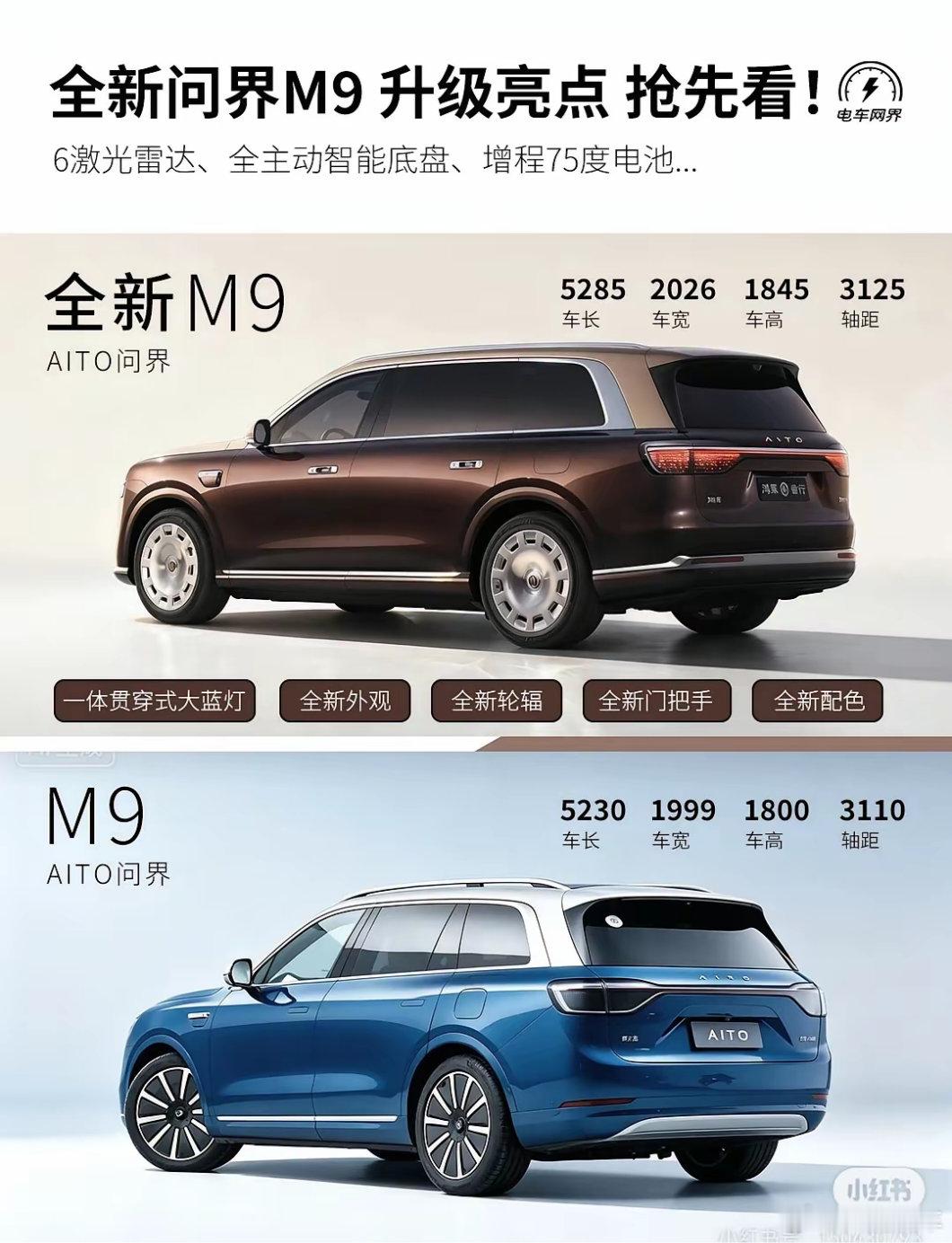 全新问界m9来了全新问界M9来了,尺寸全面加大,全新外观、全新的配色、全新的轮毂、全新把手。 配置上升级点主要:6激光雷达,全主动悬架,贯穿大蓝灯、896线激光雷达,增程最大75度/纯电最大120度(预估)电池。 目前已经预热,预计最快在5-6月份就能上,你期待吗?问界M9问界