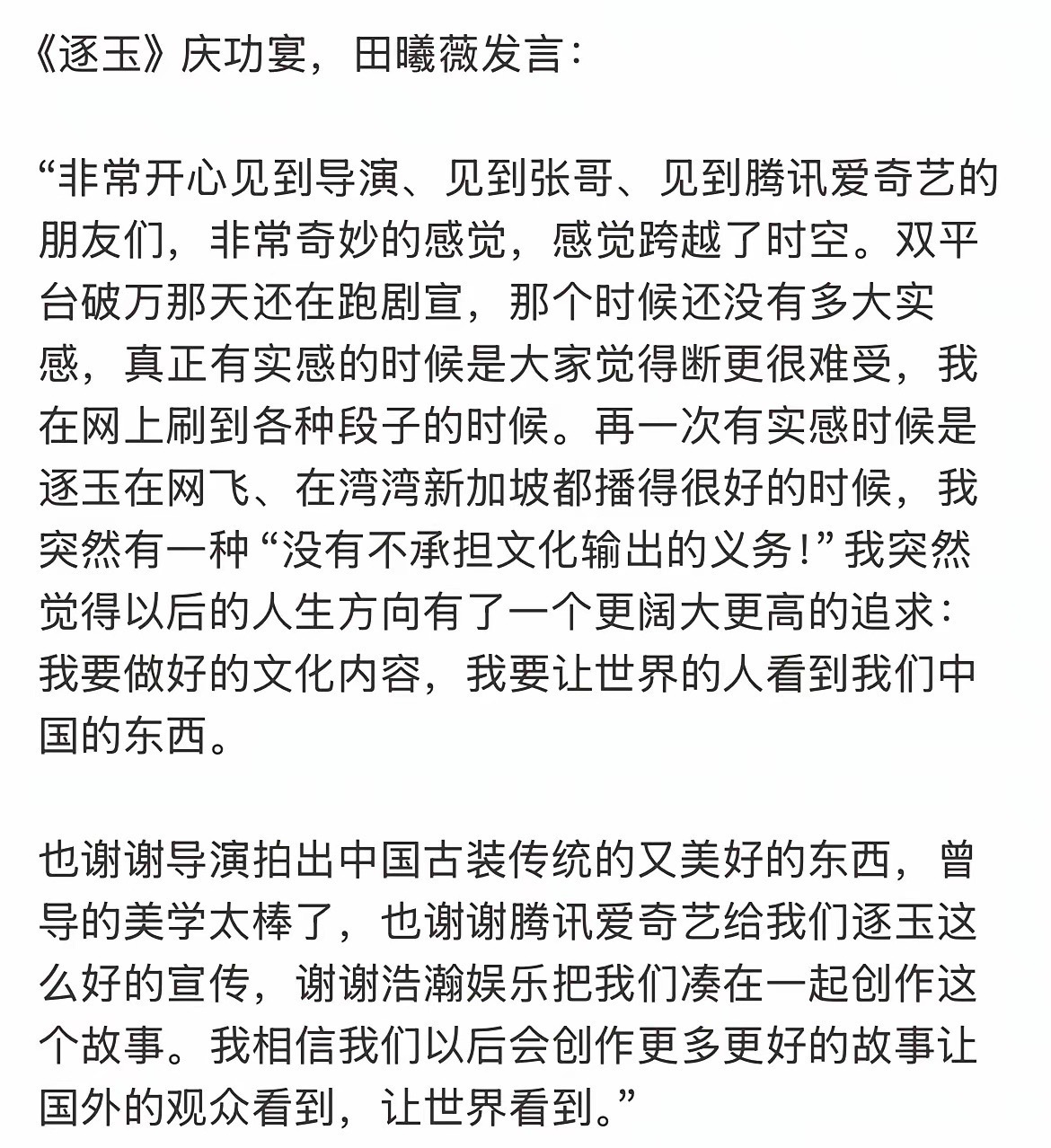 4月13日,田曦薇在《逐玉》庆功宴上的发言,让我看到了什么是虚伪与假大空!直接不