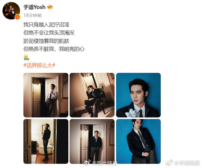 #于适高智精英感# 4月14日,分享了六宫格照片,深色夹克勾勒出利落绅士轮廓,眼神克制中带着一点撩人。既有精英感的精致得体,又不显得刻板严肃,自带故事感。而他的配文也是他在《听谁在唱歌》节目中用一天时间极限创作的《万象大道上船长大药房里有你要的药方》歌曲歌词,是用摇滚熬制的一剂治愈良方,与精英感形成极致碰撞。(现代快报)更多消息:#宋祖儿被男粉求婚##罗志祥方否认猝死传闻##网友评业内男明星咖位##胡巴每年都给井柏然过母亲节##王星和女友回应不结婚的原因#(编辑:惠天骄;审签:周乐瑞)