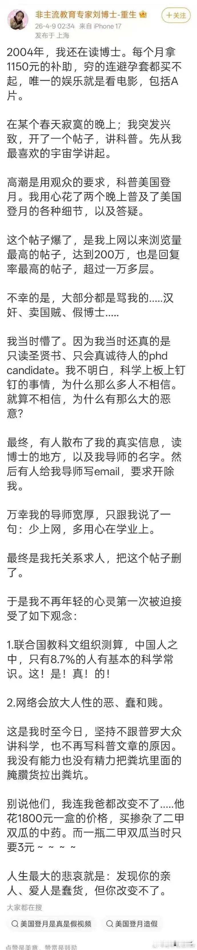 一个博士讲美国登月是真实的,被骂得狗血喷头。别说这个博士了,连我们国家航天领域的专家这样讲,一样被骂。