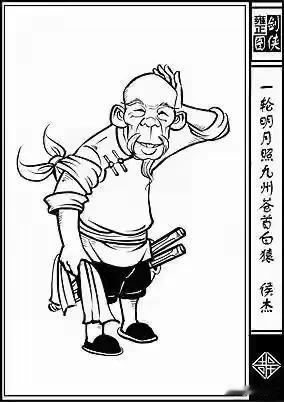 下首大旗的旗面之上绣着一个身材瘦小的小老头儿,秃头无发,形似猿猴,手里握着一对点穴双镢,身旁也绣着一行字:一轮明月照九州,侯(二)!