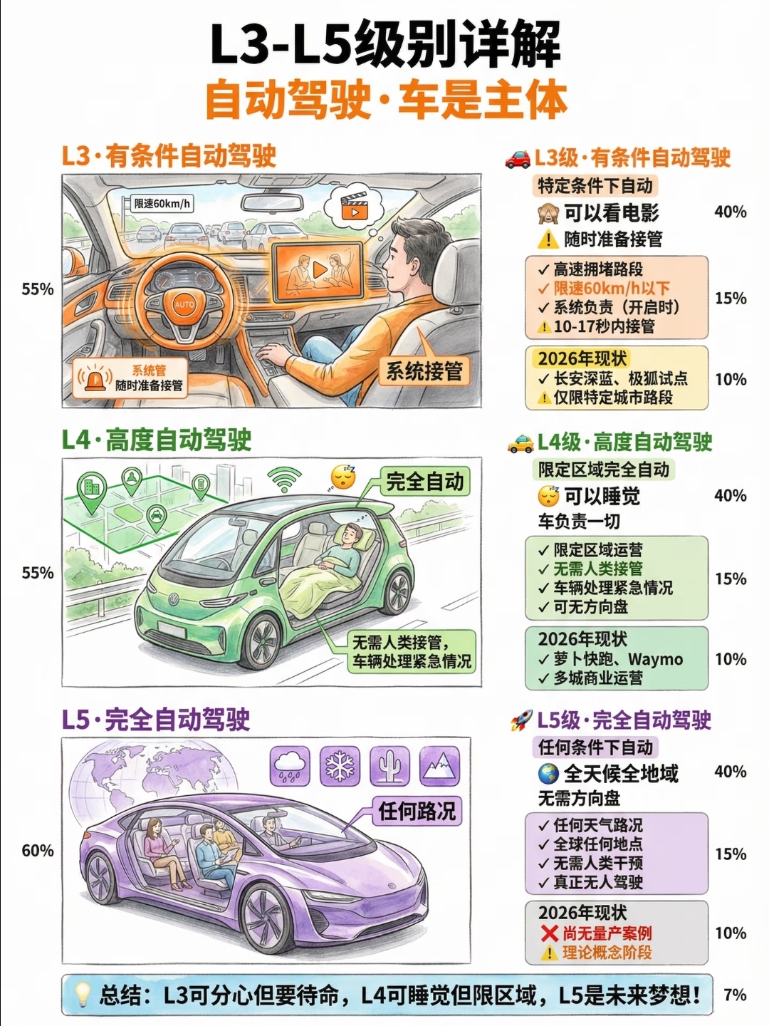 很多人买车时都会被“自动驾驶”概念绕晕,其实从L0到L5,每一级的功能、责任归属都有明确区别。L0-L2以人为主,出事车主负责;L3是分水岭,系统开启时车企担责,可分心但需随时接管;L4能在限定区域完全自动,甚至可以睡觉;L5则是全场景全自动的未来形态。你觉得我们离真正的L5全自动驾驶还有多远?你买车会更看重哪一级的辅助驾驶功能?