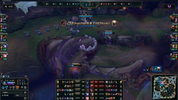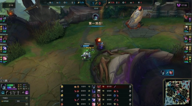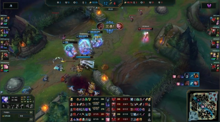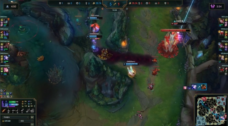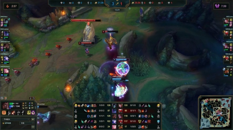 [20:12]Cube杰斯上路又被OMG三人越掉,Monki潘森来救再送一个,战绩来到0-3-1,OMG推掉WE上路一塔,经济领先5k。