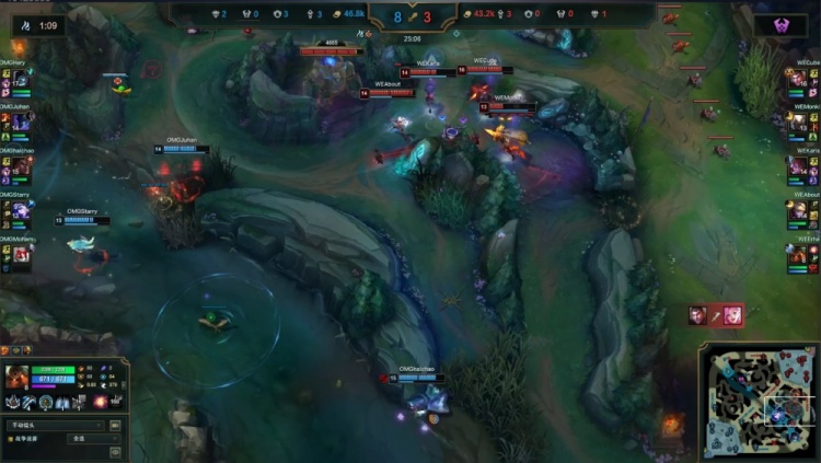 [24:28]WE五人中路推进拔掉OMG一塔,随后OMG入侵WE野区,Moham萨勒芬妮被Cube杰斯蹲到单杀,OMG急忙撤退。