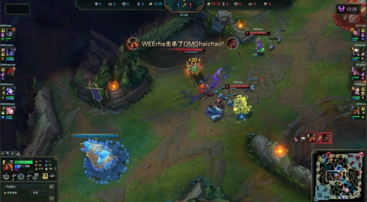 [12:13]河道团战,Juhan梦魇关灯飞脸,Starry艾希击杀与haichao梅尔联手击杀WE下野二人,OMG打出0换2,双方经济持平。