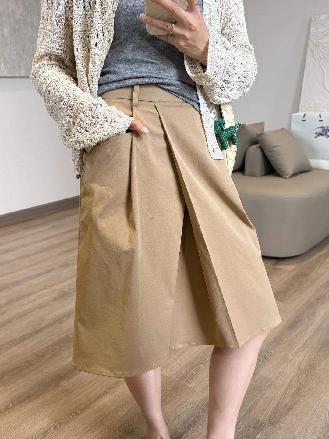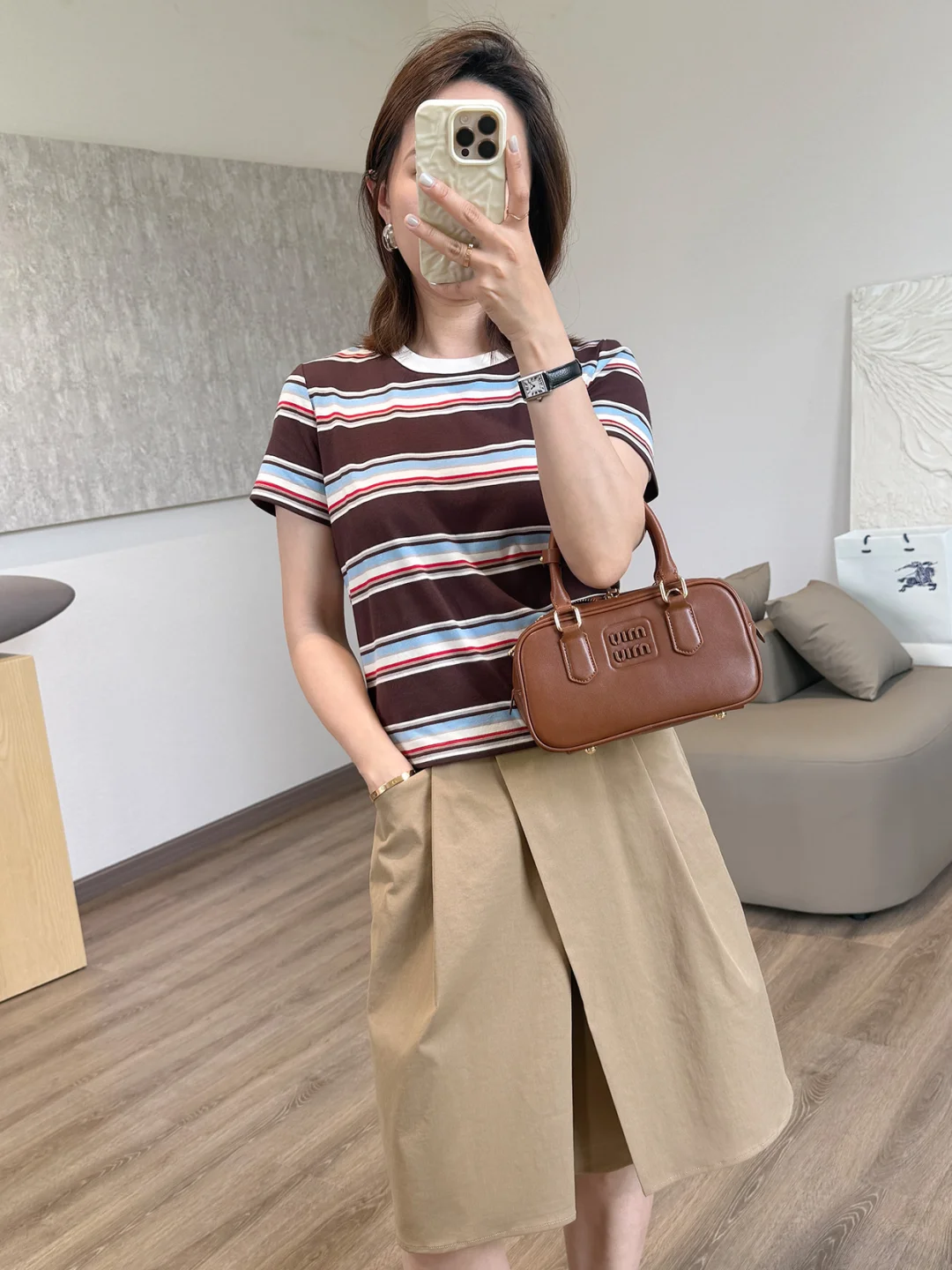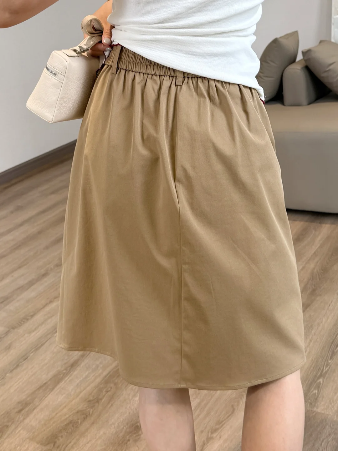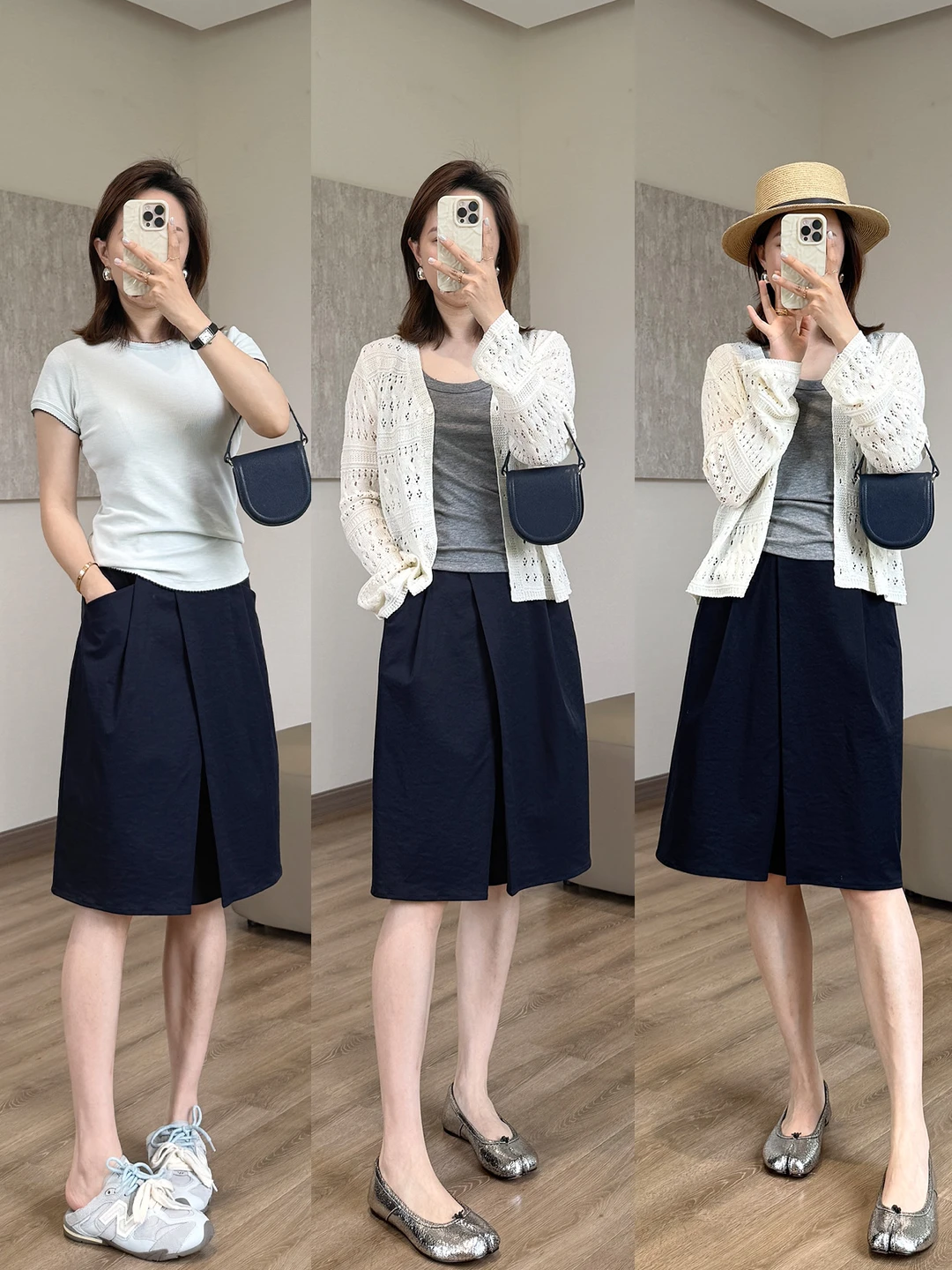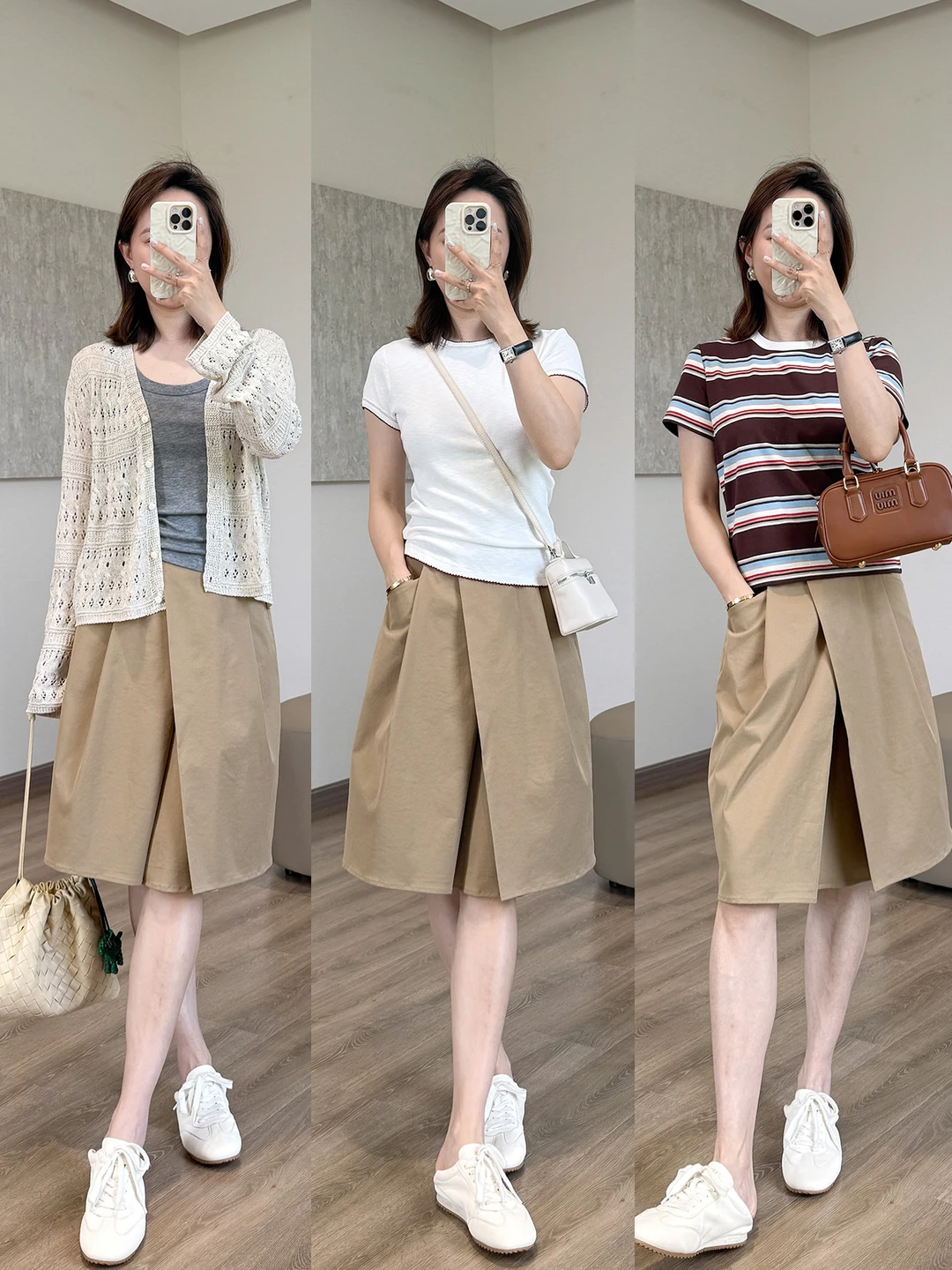 158小个子穿搭 梨形身材穿搭 夏季穿搭 半身裙穿搭 卡其色半裙 miu系穿搭 气质穿搭中裙 时髦穿搭 小个子穿搭
