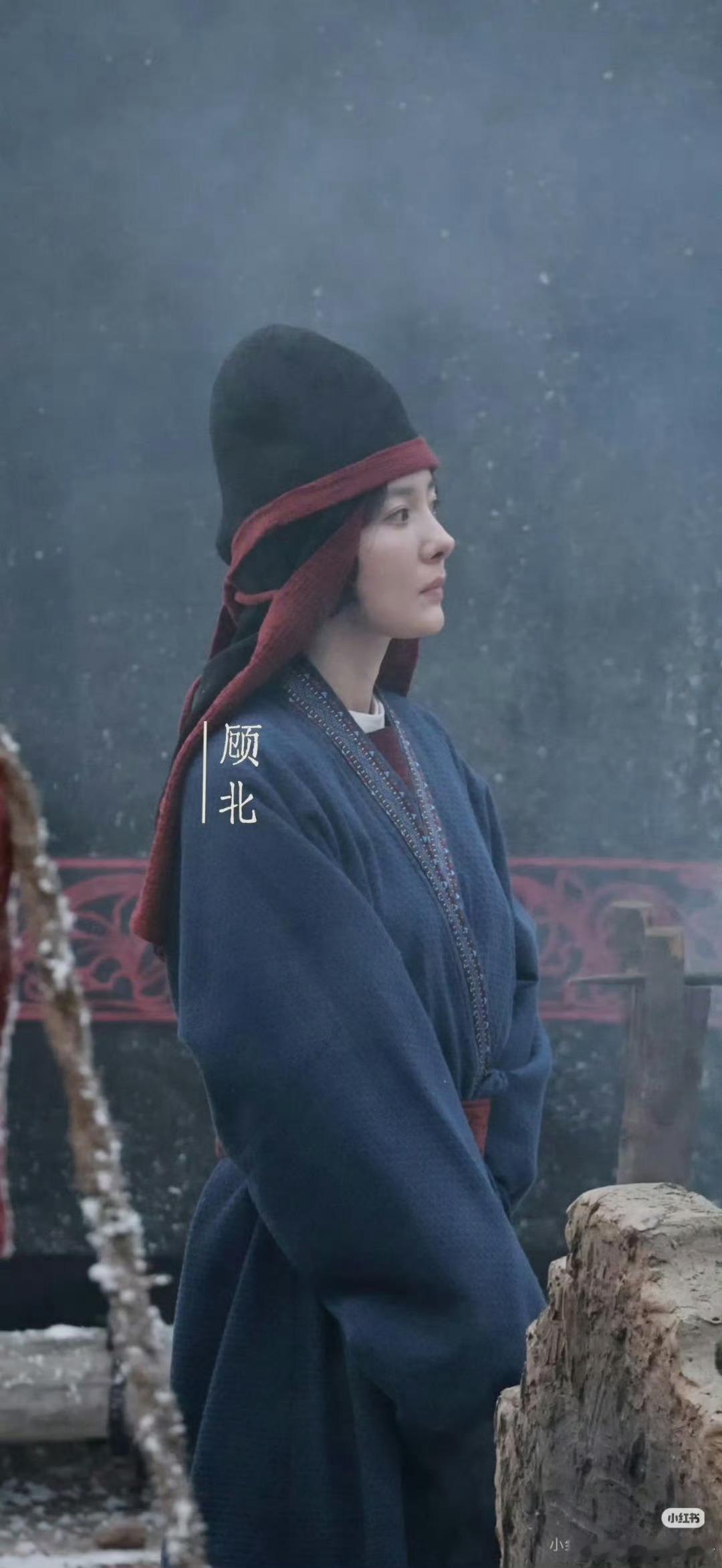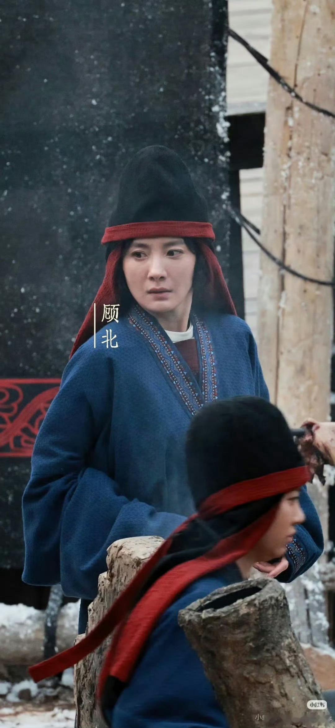杨幂红麻衣披风路透江山大同路透。网友说,这造型把美女弄的……剧组这么穷吗?