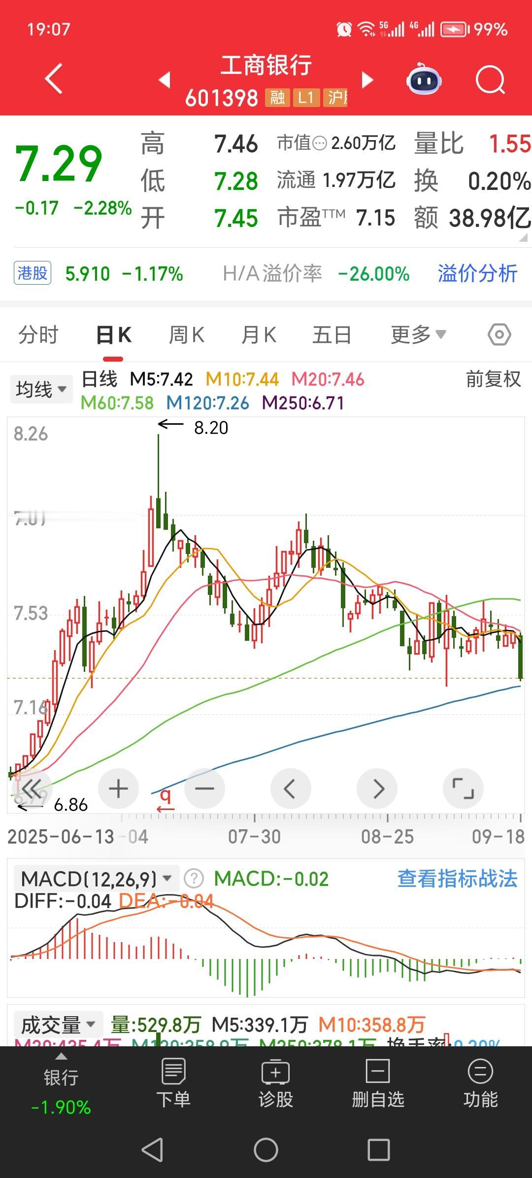 今天的下跌其实就是钱从银行股出来,银行股因为美联储降息,好日子已经到头了(请看附图工商银行和农业银行近期走势)。钱从银行股出来以后,再转入其他板块,成为调整之势。