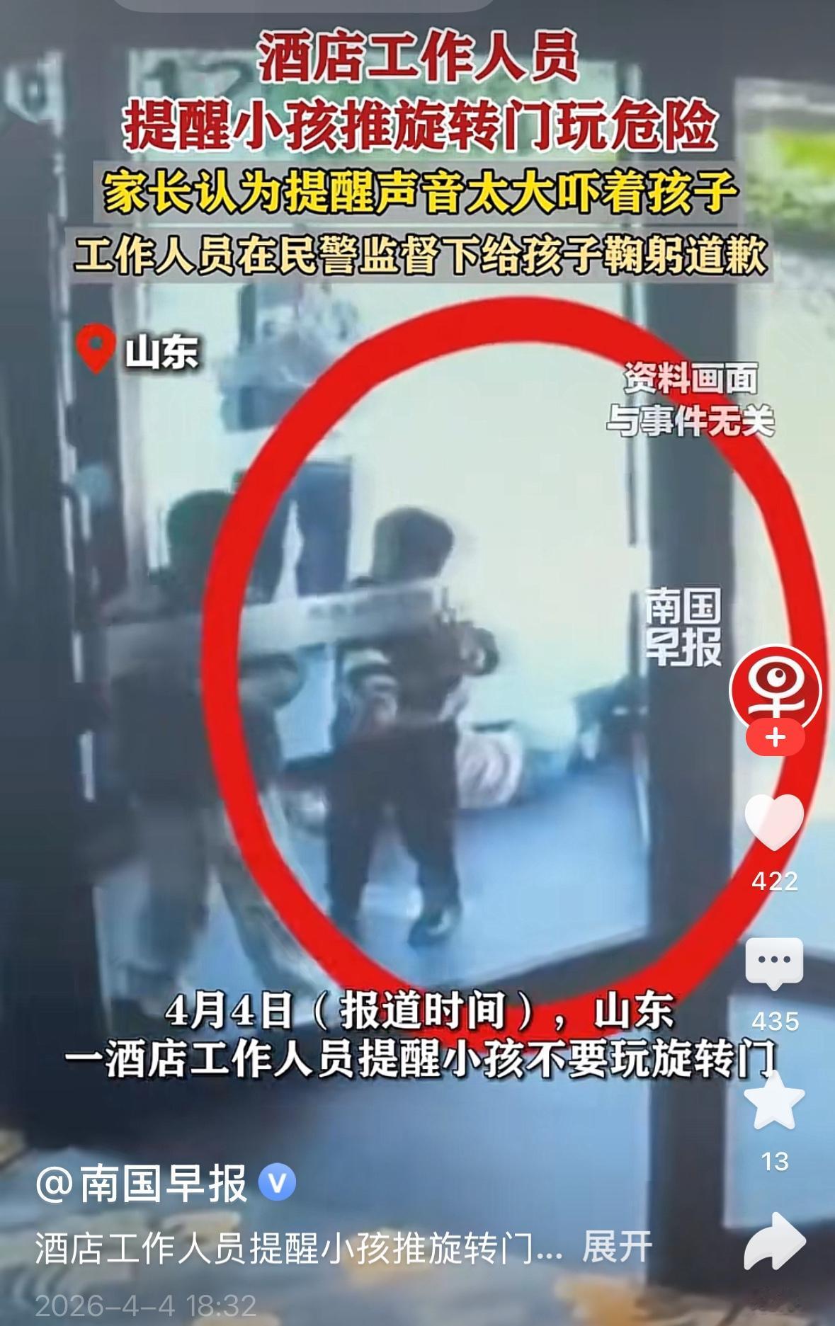 愚蠢家长,你在养废物!刚刚看到一个视频,山东某地一个饭店,几个孩子推着旋转门玩,服务员大声说:小朋友不能这么玩,快出来。不料一位家长不满声音过大,愤怒地质问:你给我吓着怎么着?最后竟然以在警察面前服务员给孩子鞠躬道歉!