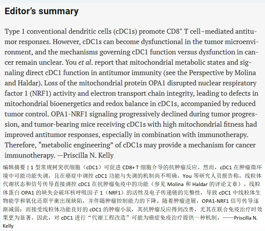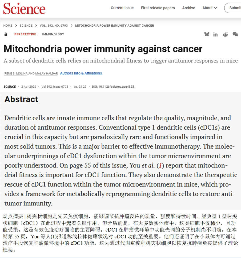 这项研究的意义在于,它把癌症免疫治疗的思路从“解除T细胞的刹车”向前推了一步:在T细胞之前,树突状细胞的线粒体健康状态决定了整个免疫反应的起点。维持OPA1-NRF1轴的正常功能,保护线粒体的能量代谢和氧化还原平衡,可能成为下一代免疫治疗的新靶点。肿瘤在消耗免疫细胞的能量,而科学正在学习如何给免疫系统充电。