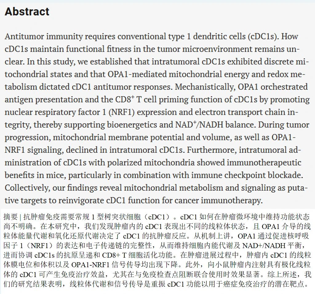 这支研究团队发现,肿瘤微环境里的1型常规树突状细胞(cDC1s)——那些负责激活T细胞、启动抗肿瘤免疫反应的“指挥官”——它们的线粒体正在被肿瘤慢慢“耗死”。
