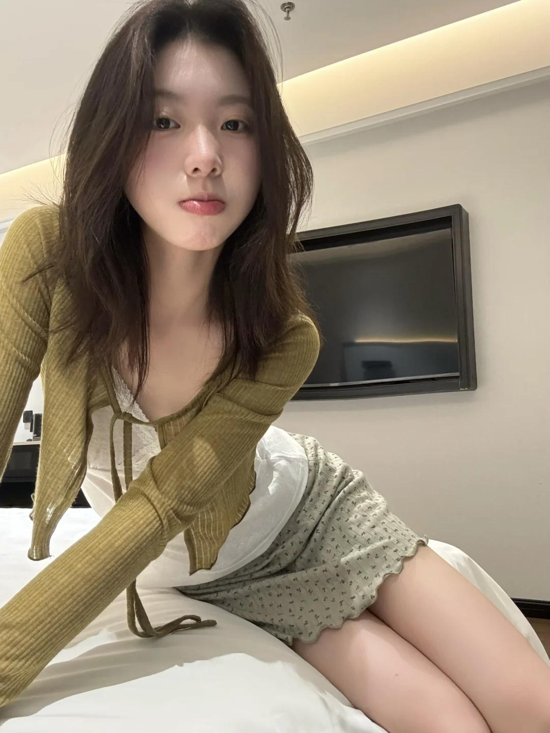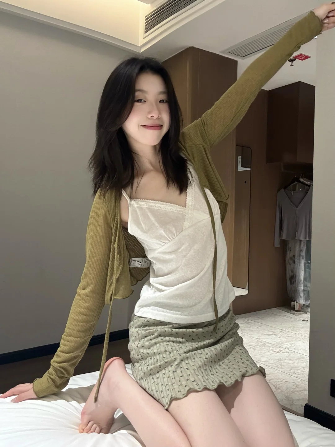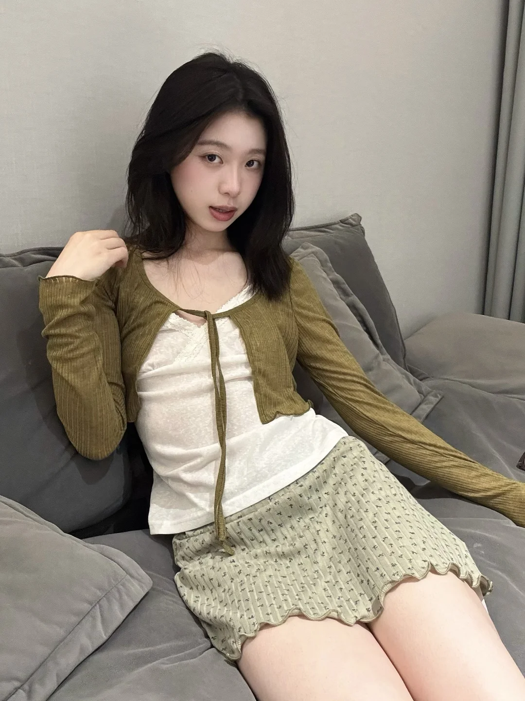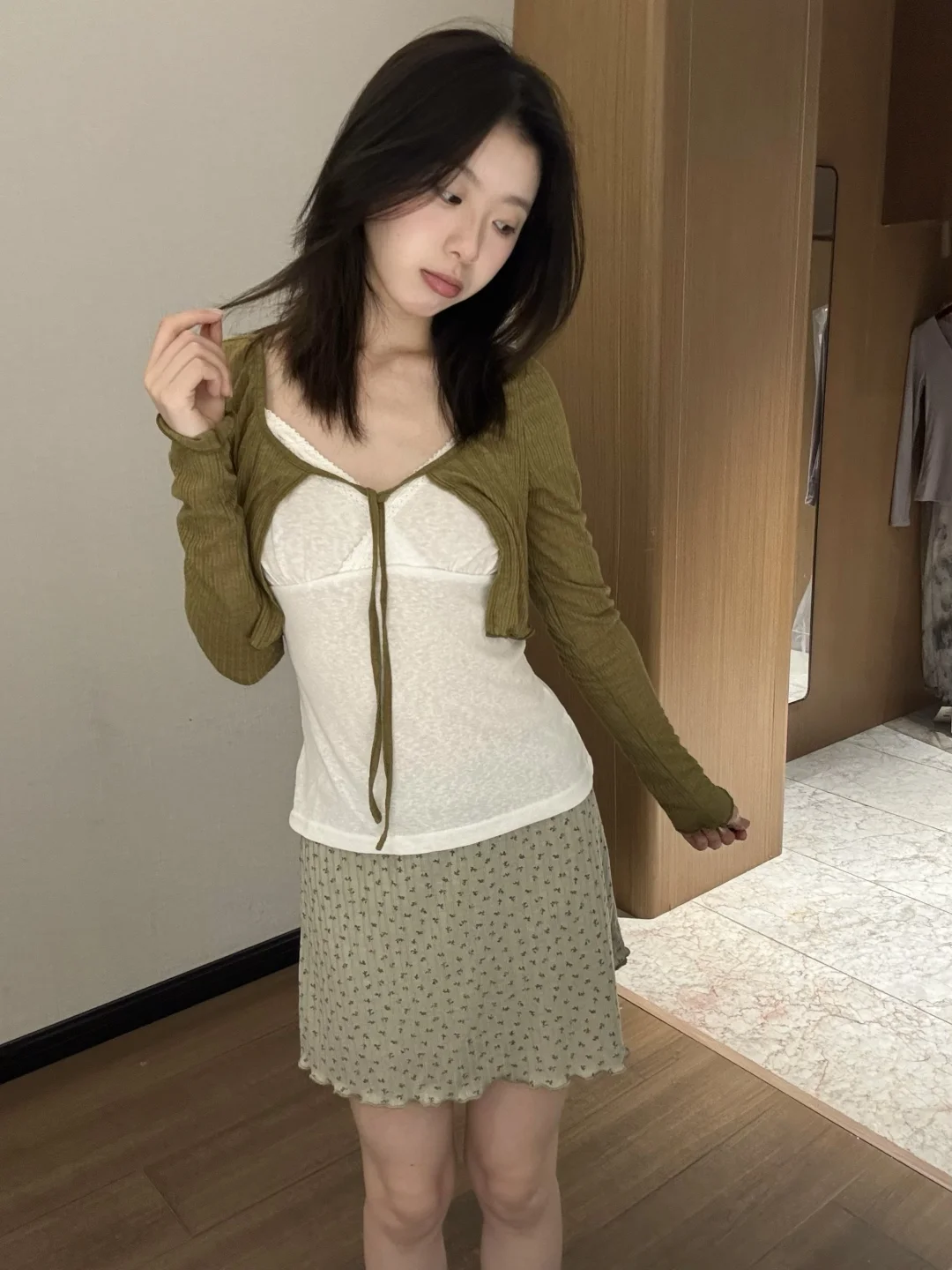 橄榄绿针织开衫+奶白吊带+同色系碎花半裙🌸