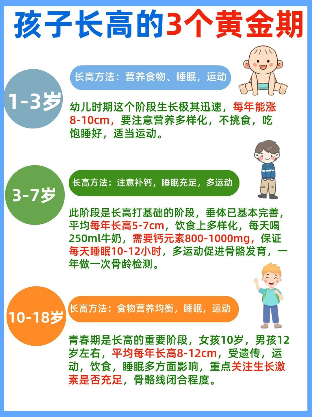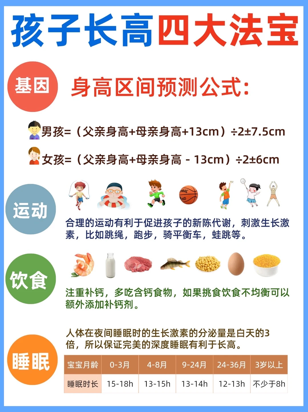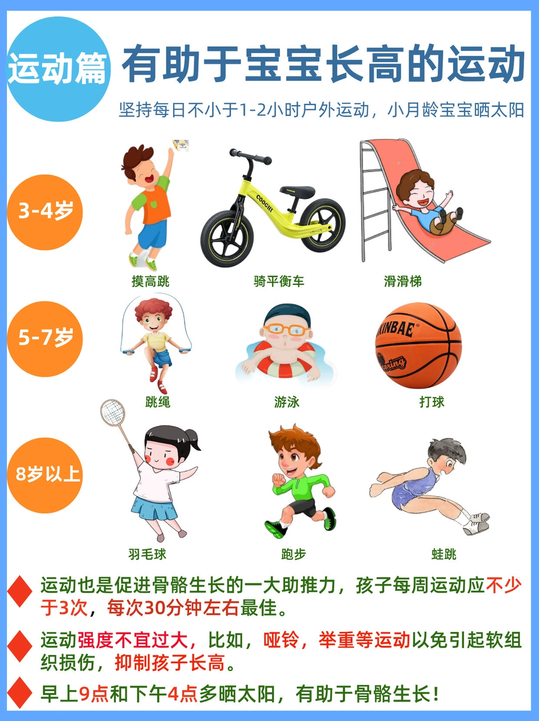 🔺运动是促进骨骼生长的一大助推力,孩子每周运动应不少于5次,每次30分钟左右,比如摸高挑,骑平衡车,跳绳等具体运动。