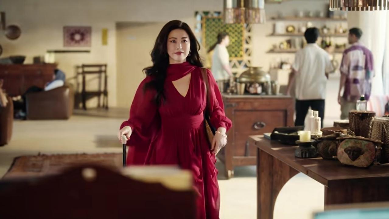 只见她一袭红色衣裙,披着波浪的大卷发,烈焰红唇,再搭配一款包包,直接把氛围感拉满。