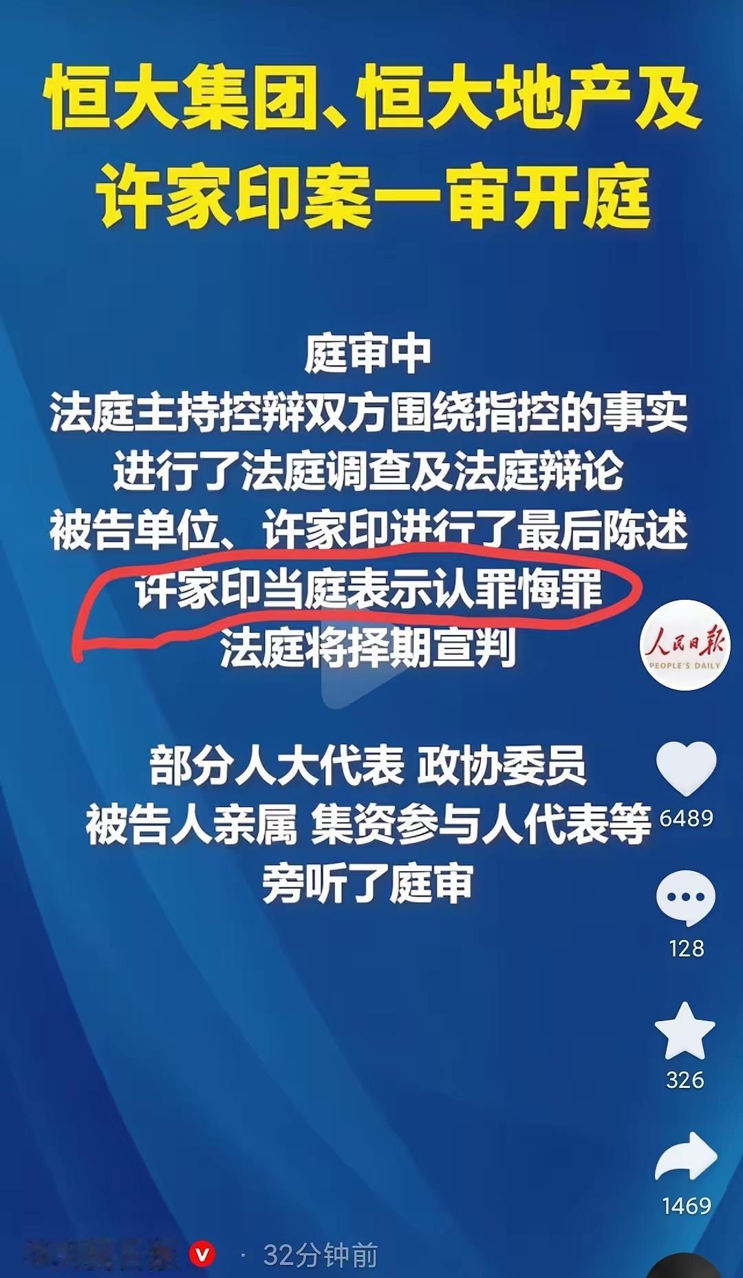 刚才,恒大集团许家印当庭认罪! 许总就是牛,能在银行贷了几仟亿外债2万亿真是太