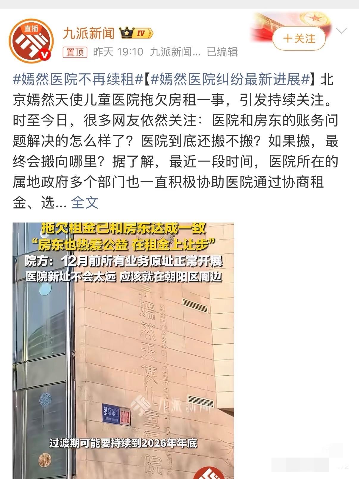 4月13日确认了,医院和房东谈妥了,不再续租,预计2026年底前搬走,新址大概率还在朝阳区。院方说12月之前所有业务正常,不影响孩子看病。