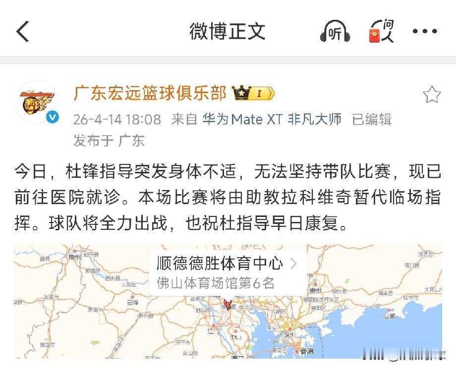 就在刚刚广东宏远官方社交媒体发布消息说到,杜锋因为突发身体不适,已经前往医院治疗,将会缺席与宁波队的临场指导,改为助理教练接替指挥。今晚与宁波队的比赛是球队稳定前四的一场关键比赛,同时上一场双方交锋广东宏远是被对手击败,今晚全队都非常渴望复仇。