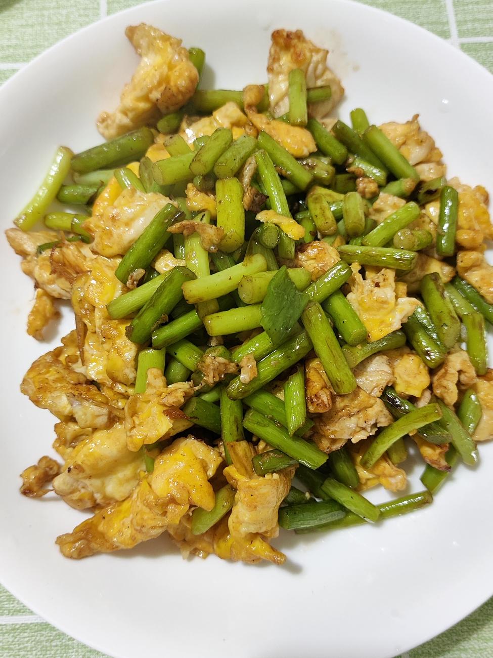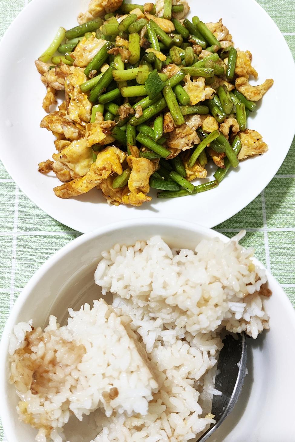 今天的晚饭,炒蒜苔配米饭,太香了。