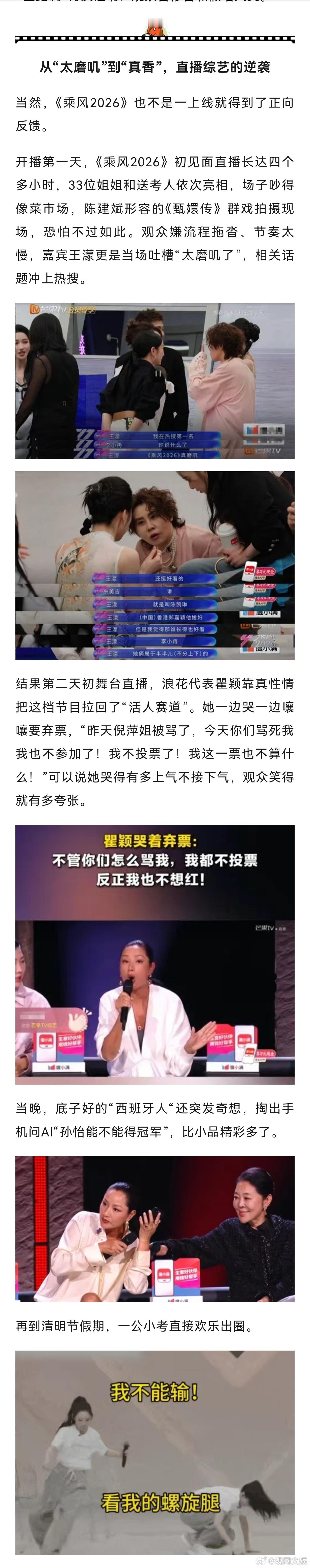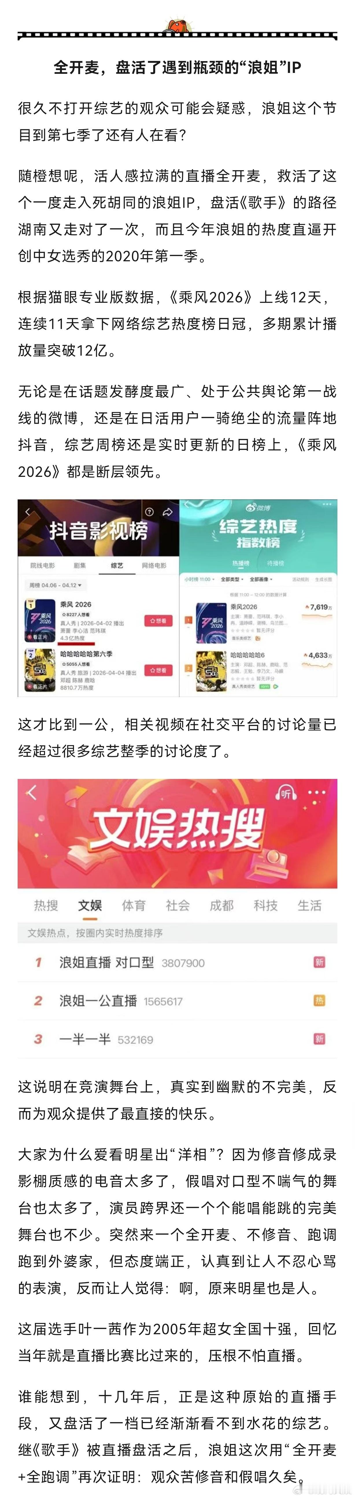谁能想到,十几年后,正是这种原始的直播手段,又盘活了一档已经渐渐看不到水花的综艺。继《歌手》被直播盘活之后,浪姐这次用“全开麦+全跑调”再次证明:观众苦修音和假唱久矣。