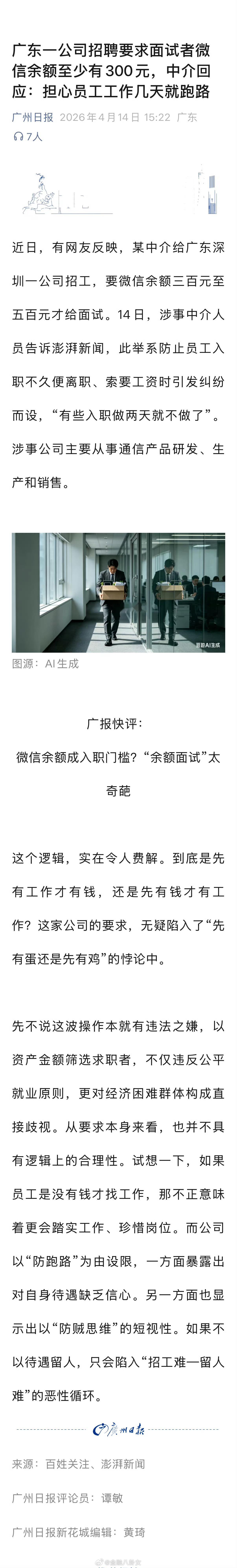 广东一公司招聘要求面试者微信余额至少有 300元,中介回应:担心员工工作几天就跑