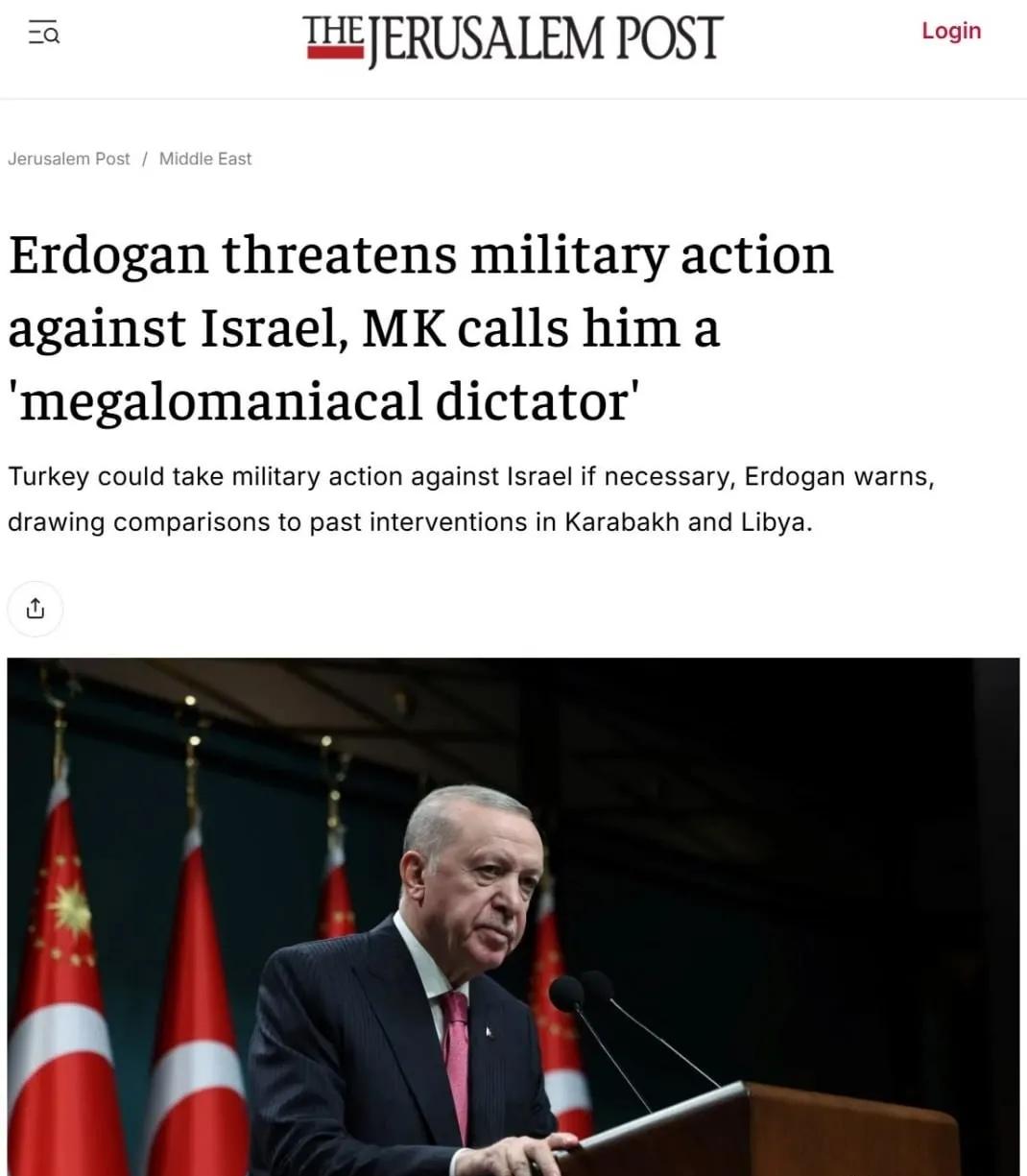 土耳其总统埃尔多安向以色列发出战争威胁,以色列文化遗产部长阿米哈伊.埃利亚胡今天