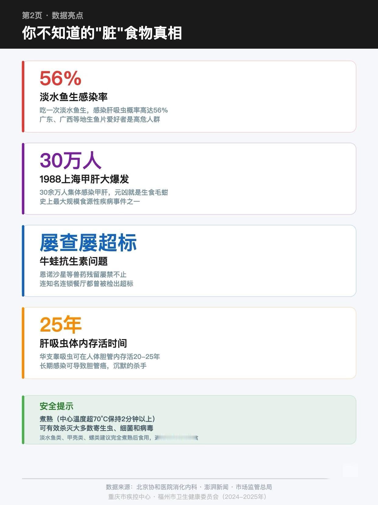 别光盯着小龙虾啦,这5种食物才是寄生虫“重灾区”——牛蛙、生腌、淡水鱼生、田螺、毛蚶。就说淡水鱼生,感染肝吸虫的风险能到56%,虫子还能在体内活很久。生腌看着新鲜,其实藏着不少寄生虫和细菌。毛蚶更得注意,1988年上海甲肝大爆发就跟它有关。还是那句话,该煮熟的千万别偷懒,别拿健康赌运气。
