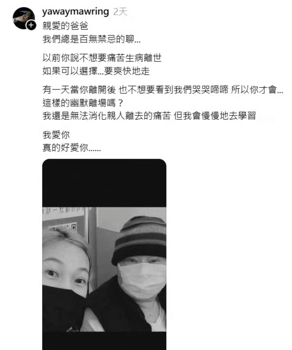 虽不知S妈此刻有多难过,但相信有大小S陪伴在侧,定能给予她温暖的慰藉。雅维・茉芮也失去了至亲的父亲,愿他和家人能在思念中慢慢平复情绪。
