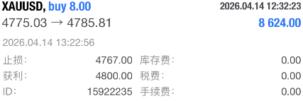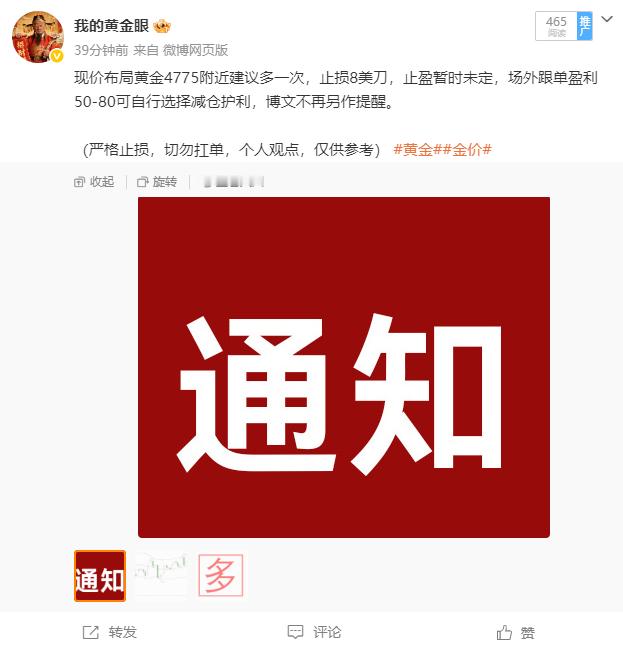 4775多单已再4785位置完成全仓撤离,利润达到百点不再贪吃,后行情上拉至4787又回撤至4782,跟单几十点还是依旧随便吃。几秒钟的功夫,最佳离场点就过去了。恕我只有一双手,实盘学员那边必须第一时间发指令带离场,微博真的做不到秒同步通知。这就是微博公开跟单最大的弊端:行情瞬息万变,无论点位、减仓、离场时机永远有延迟,跟实盘一对一实时提醒完全是两个体验。不去纠结已走完的行情,我们耐心等晚间 4790-4800 关键阻力带,给到合适位置就反手布局空单。微博会尽量同步提示,但永远是实盘学员先拿到最及时的指令。黄金金价