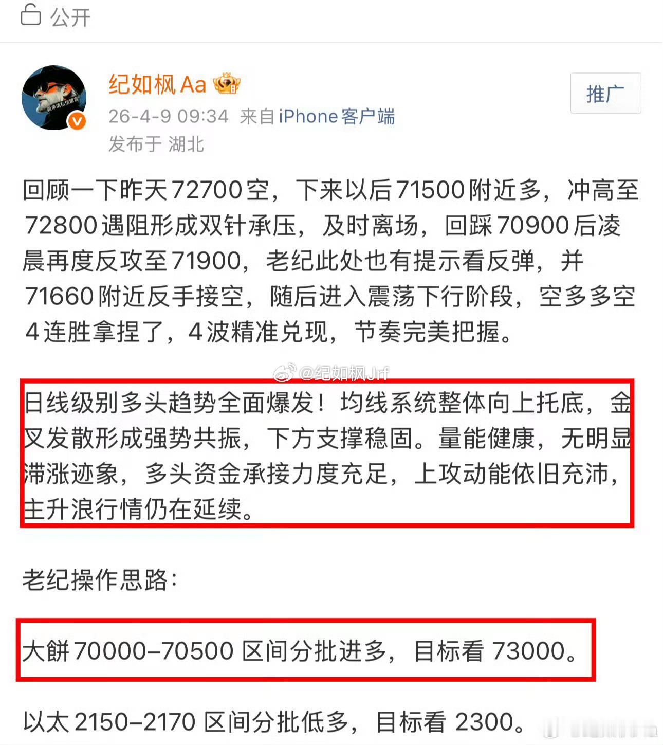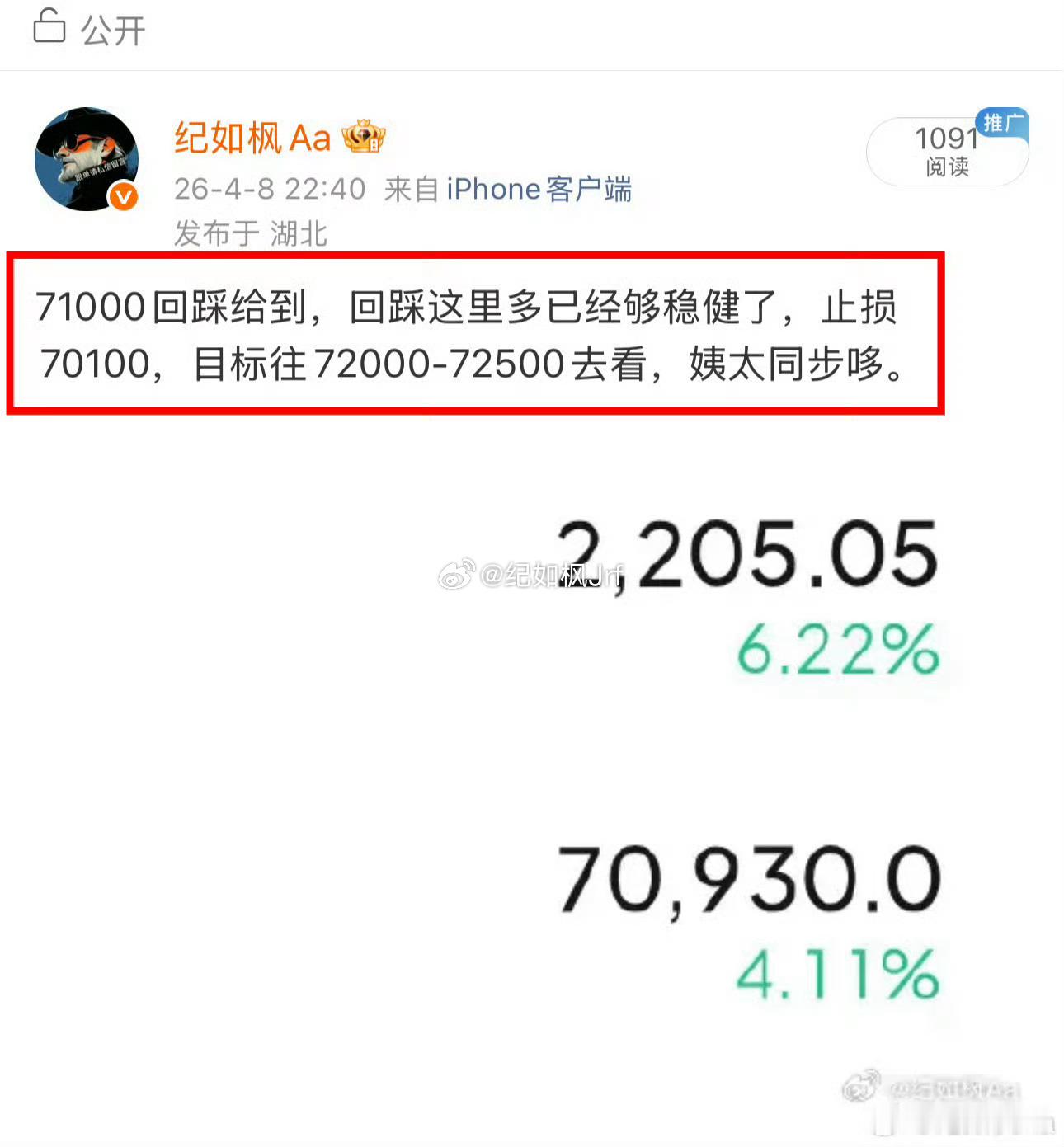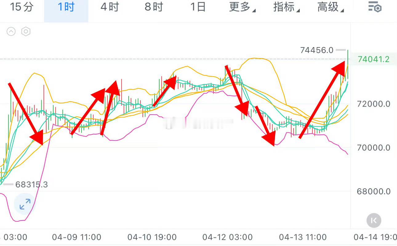 上周72700空回调给到71200,后续70900多反弹72000,再次回落70500两次提醒多,包括71500再追多给到7300073000附近提示看回调给到71400反弹71700再次追空给到70500昨日70900附近多目前冲破74000。