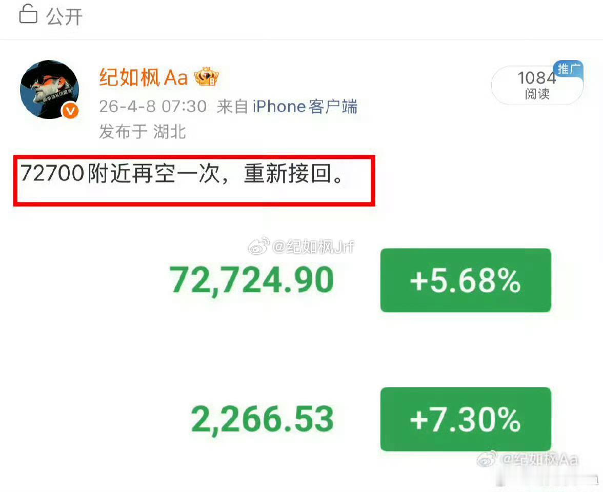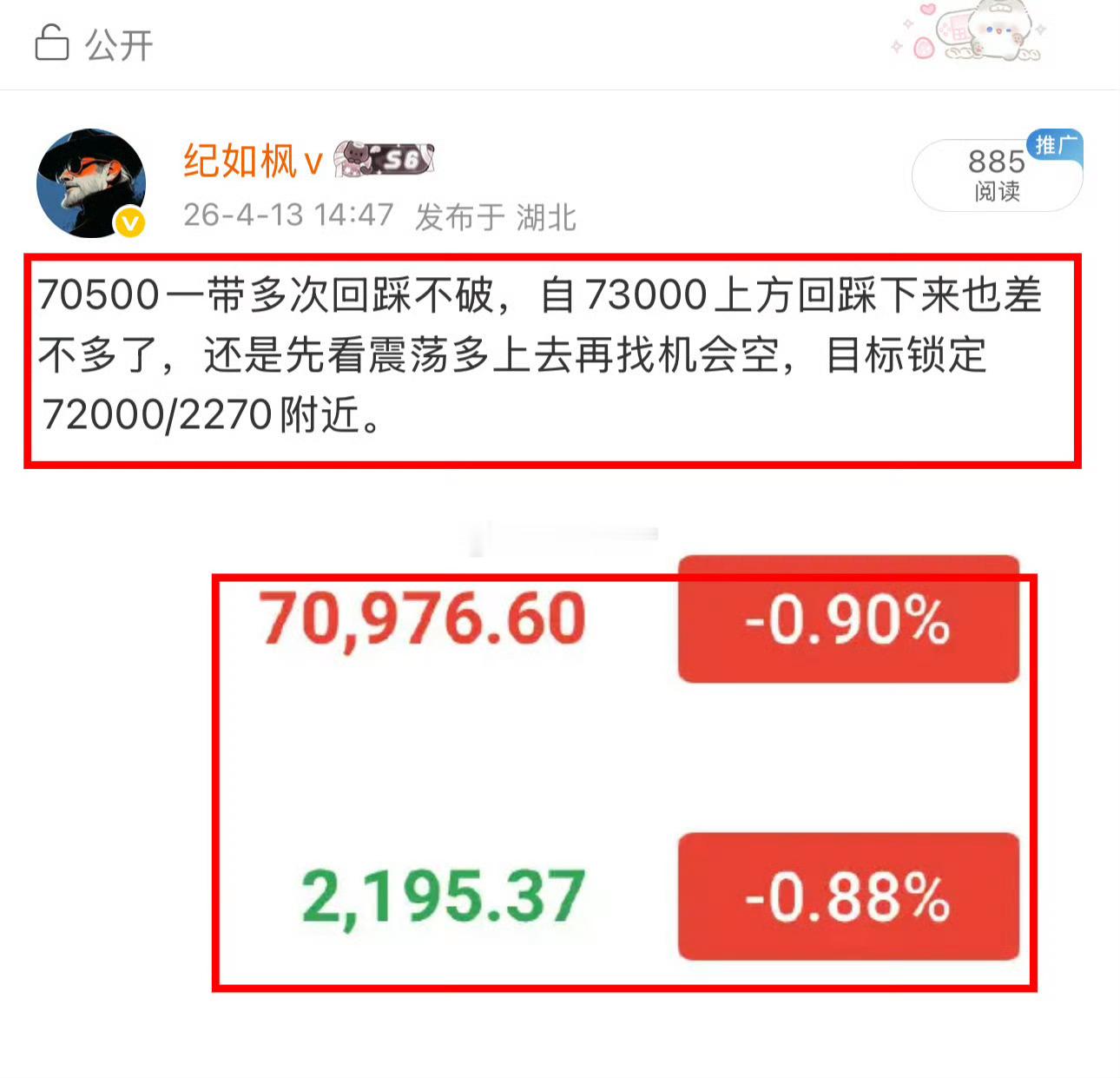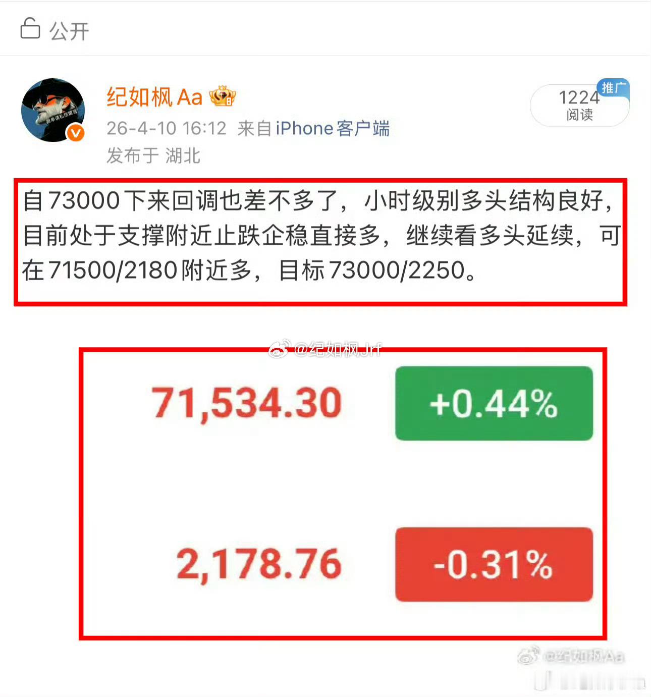 上周72700空回调给到71200,后续70900多反弹72000,再次回落70500两次提醒多,包括71500再追多给到7300073000附近提示看回调给到71400反弹71700再次追空给到70500昨日70900附近多目前冲破74000。