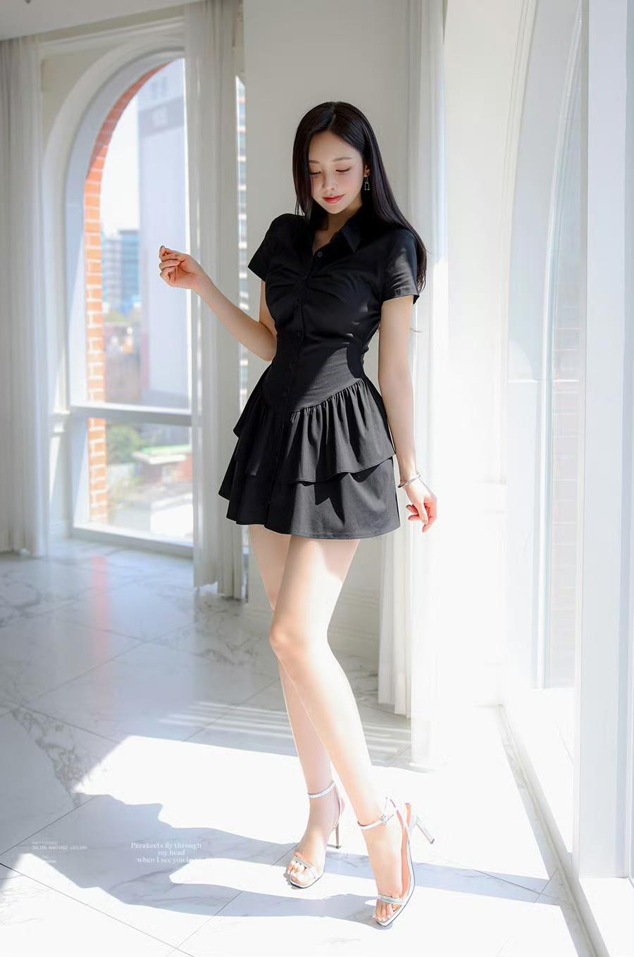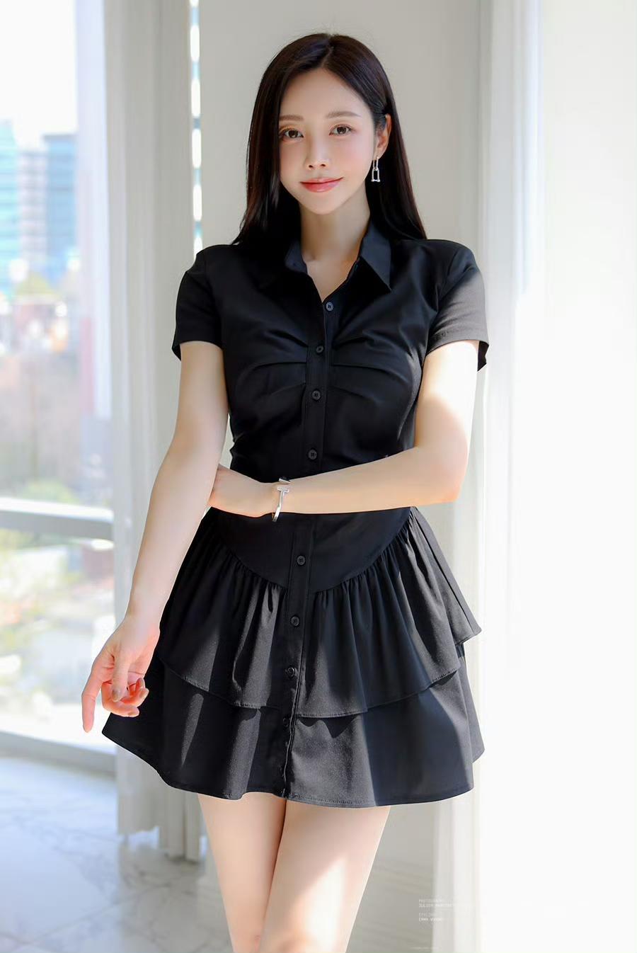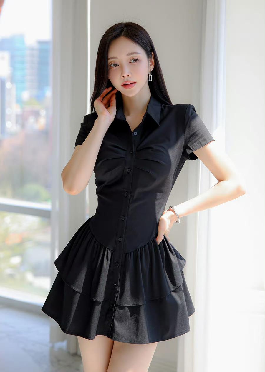 利落的衬衫领修饰肩颈线条,收腰设计精准勾勒身形,层层叠叠的裙摆摇曳出柔美感,刚柔并济间,把优雅刻进细节。