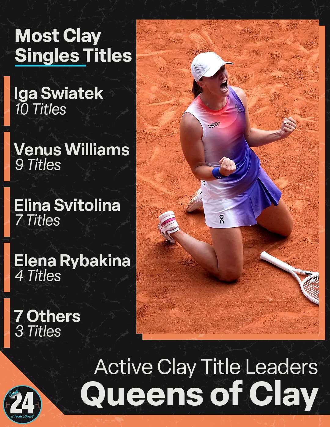 现役球员WTA红土赛事冠军数量:单打 — 斯瓦泰克10冠、大威9冠双打 — 埃拉